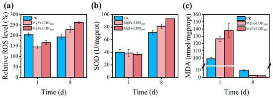 Figure 4c–f show the removal rates of TN, TP, NH3-N, and COD from the biogas slurry by C. pyrenoidosa after the addition of MgFe-LDH. After 8 days of cultivation, the MgFe-LDH100 and the MgFe-LDH200 treatment removed 93.67% and 96.86% of TN, respectively, both significantly higher than the control’s 78.03%. Similarly, TP removal rate reached 69.80% and 73.40% in the MgFe-LDH-treated groups, compared to 55.80% in the control. NH3-N removal rate was also improved, with rates of 84.67% and 88.94% in the MgFe-LDH100 and MgFe-LDH200 treatments, respectively, versus 77.63% in the control. Although MgFe-LDH enhanced COD removal rate in the early stages, no significant differences were observed among the treatments by day 8, with final removal rates of 86.77%, 88.78%, and 90.67% for the control, MgFe-LDH100, and MgFe-LDH200 groups, respectively. In summary, the addition of MgFe-LDH significantly improved the carbon fixation capacity, growth, and nutrient removal efficiency of C. pyrenoidosa cultivated in biogas slurry. The enhanced biogas slurry purification capability of C. pyrenoidosa with MgFe-LDH addition was not only due to the promotion of carbon fixation but was also closely related to the increased stress resistance of C. pyrenoidosa.