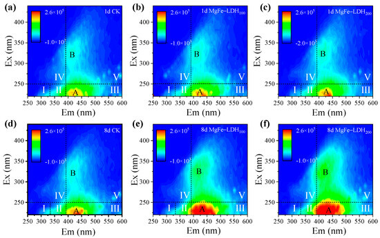 The secretion of EPS is related to cell surface adhesion, biofilm formation and pollutant removal [55,56], influencing the performance and stability of the co-culture system. As observed in the SEM images (Figure 1e), the presence of MgFe-LDH stimulated substantial secretion of EPS by C. pyrenoidosa. To further evaluate dynamic changes in EPS secretion and composition, 3D fluorescence spectra of EPS were analyzed on the first day and the eighth day (Figure 6). In all treatments, two peaks were identified in the 3D-EMM spectra. Peak A, located in region III, is associated with fulvic acid-like substances, which play crucial roles in nutrient cycling, metal complexation, and the transport of pollutants in the environment [57,58]. Peak B is indicative of humic acid-like substances, another key component of EPS known for its role in adsorbing and binding pollutants [59,60]. When exposed to biogas slurry after 1 day, a slight increase in the fluorescence intensity of peak A was observed in the system with MgFe-LDH, suggesting that MgFe-LDH promoted the early accumulation of fulvic acid-like components within the EPS. After 8 days of cultivation (Figure 6d–f), the fluorescence intensities of both Peak A and Peak B across all treatments showed a marked increase compared to the first day. This enhancement indicated that C. pyrenoidosa continuously secretes EPS as a protective mechanism against environmental stressors present in the biogas slurry. Notably, treatments supplemented with MgFe-LDH exhibited stronger fluorescence intensities for both peaks. This observation implied that the presence of MgFe-LDH appeared to act as an effective promoter of EPS production, enhancing the microalgae’s ability to withstand and adapt to the stressful conditions of the biogas slurry. This promoting effect of MgFe-LDH could be attributed to its ability to directly promote EPS production, create a more favorable microenvironment for synthesis, and provide surfaces for EPS to adhere to. By promoting the secretion of EPS, MgFe-LDH could improve the microalgae’s capacity to form biofilms, which are known to be more effective in pollutant removal and stress resistance [61]. This discovery highlighted the potential of using MgFe-LDH as a biostimulant to improve the performance of microalgae in wastewater treatment.