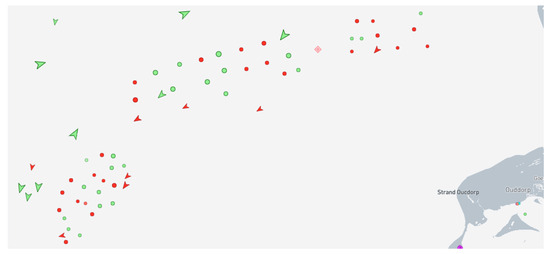 The port of Rotterdam [22] is the largest in Europe and one of the largest in the world (tenth in the world port ranking) [23]; therefore, a large number of ships are moored at the approaches to the port, waiting for entry into the port or orders.