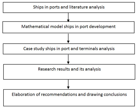 The following steps of the probability of the ships’ stay in ports research methodology were applied to conduct the research (Figure 8). After carrying out a review of the real ports’ situation and literature, the mathematical model was developed.