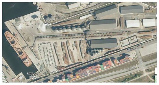 As a case study, a sustainable multifunctional port terminal with key sustainable terminal features was selected, which has reached its full planned design capacity and handles timber, grain, and other general cargo. The grain storage capacity is up to 100,000 t, timber storage capacity is up to 80,000 t, and other cargo storage capacity is up to 10,000 t. Over the past year, up to 1,000,000 t of grain, up to 600,000 t of timber, and up to 400,000 t of other cargo have been handled. The terminal can simultaneously store up to 320,000 t of various cargoes. The terminal uses about 90% of renewable electricity for its own needs and partially supplies it to ships moored at the terminal quays. The area of the terminal territory is about 12 ha (Figure 9).