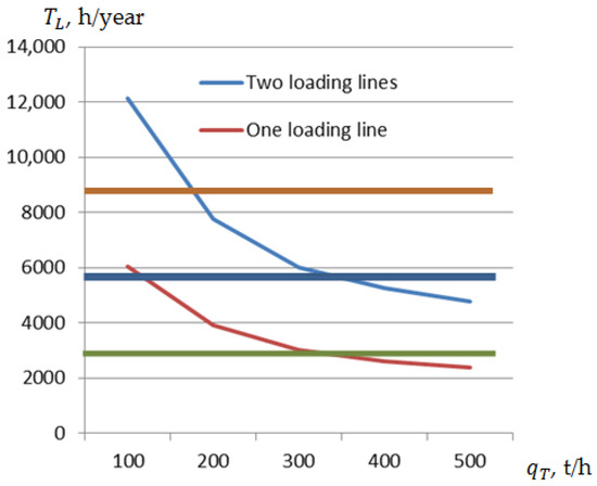 To process the projected volume of timber cargo, it is necessary to increase either the loading intensity, using, for example, two loading lines, or increase the capacity of the loading equipment so that the loading equipment allows processing up to 350 t/h of timber cargo per day (16 working hours, i.e., two shifts), or to use three shifts, or to process two ships simultaneously, i.e., to increase the number of berths through which timber products can be loaded. Figure 10 presents the possible loading intensity and the possibilities of processing the projected volume of cargo using different methods and systems.