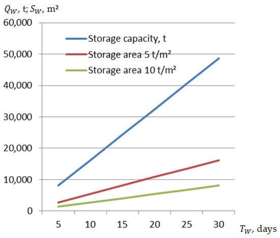 The results of the terminal warehouse capacity () and storage area () depend on the storage time of the timber cargo at the terminal (), which is assumed to be from 5 days to 30 days, the terminal storage volume utilization factor (), which is assumed to be about 0.8, the permissible distributed load size of the storage space (), which is assumed to be from 5 to 10 t/m2, and the storage area utilization factor (), which is assumed to be about 0.6, are presented in Figure 11.