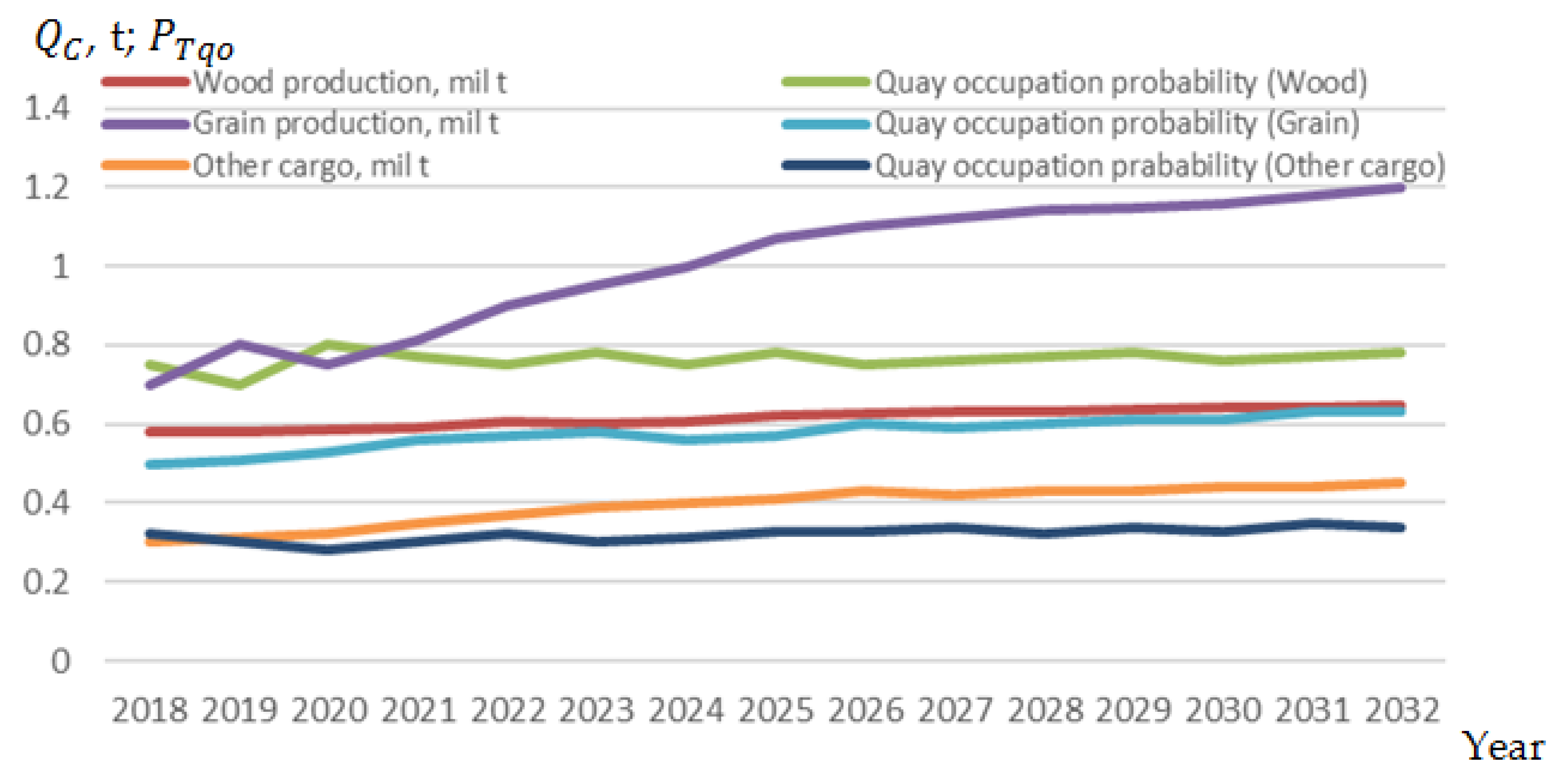 Year | Cargo Flow, Thousand Tons | Forecast Coefficient | Factor 1 | Factor‘s Weight | Factor 2 | Factor‘s Weight | Factor 3 | Factor‘s Weight | Factor 4 | Factor‘s Weight | Factor 5 | Factor‘s Weight | Multicriteria Coefficient | Forecast Cargo Flow | = 12) |