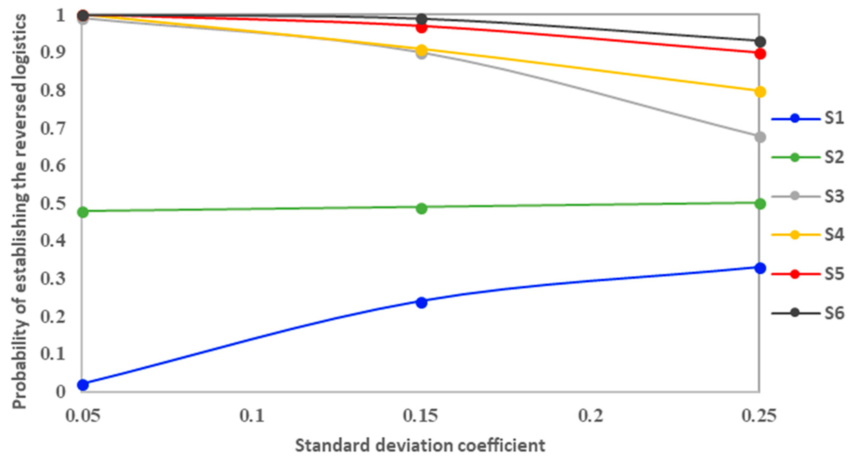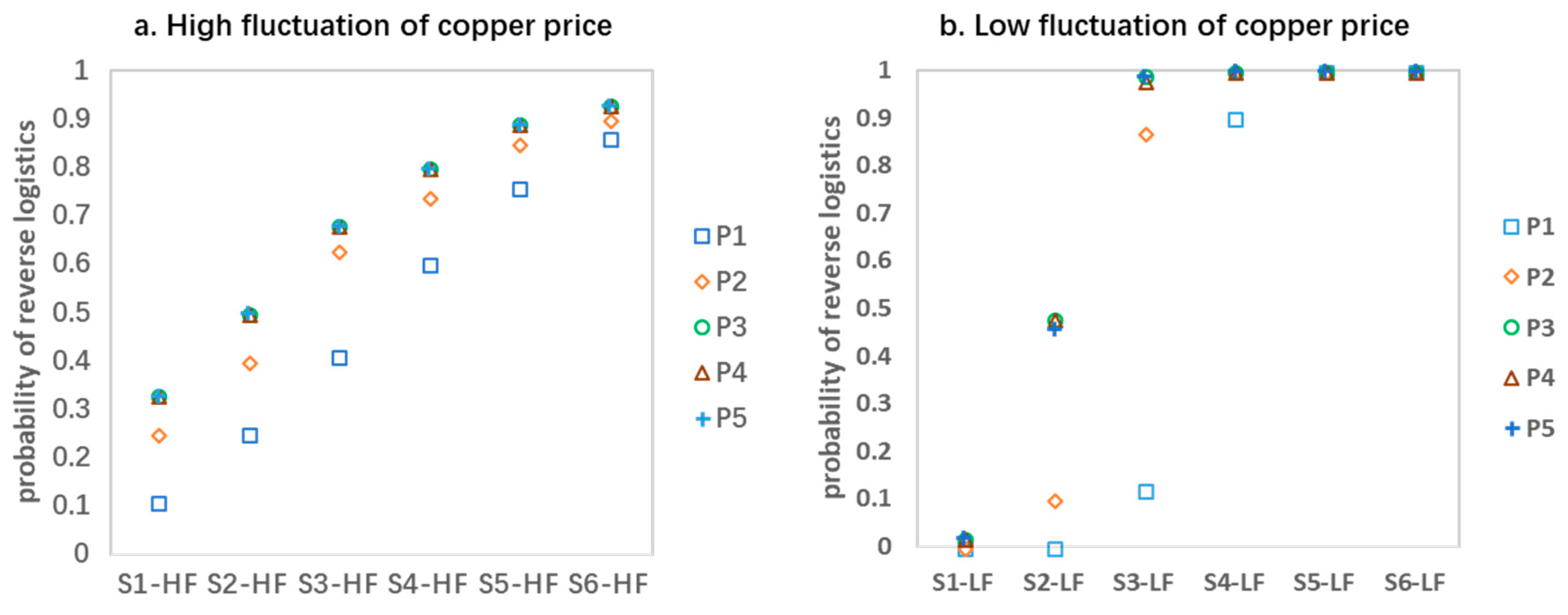 Figure 5b, when the expected price reaches P3, the PCRL is close to one, and when the expected price is low, the probability is close to zero, such as S1-LF. This is because the volatility is small; whether to build reverse logistics or not depends on the static model of the expected price. When the expected price is too low or too high, the differentiation is especially obvious. When the copper price is low, even if the demand fluctuates, it tends not to build reverse logistics. When the price of copper is high and the demand fluctuates, it always tends to build reverse logistics.