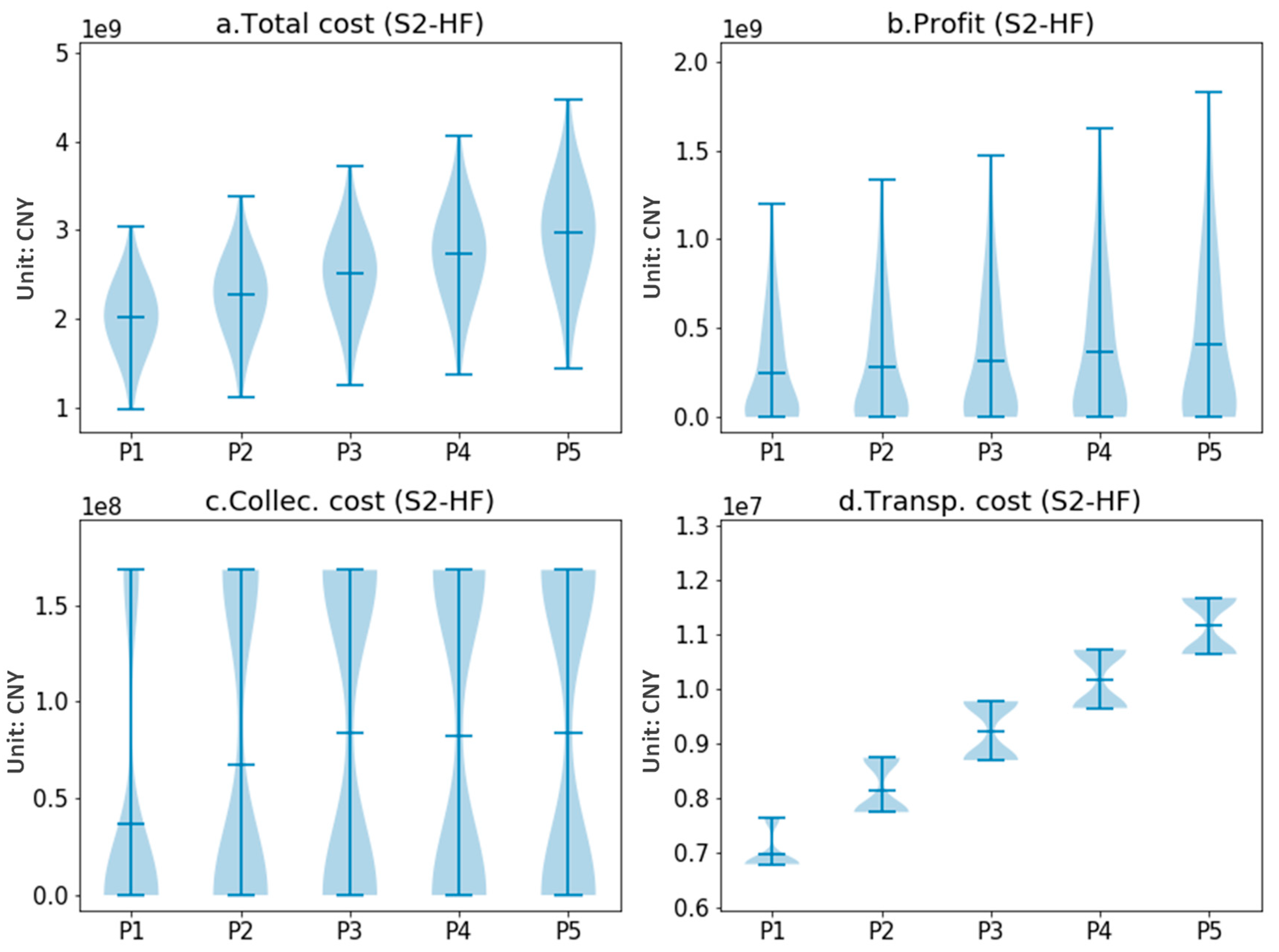 In the collection cost and transportation cost, the data corresponding to P1 and P2 is smaller than that of P3~P5. That is relevant to the PCRL. It can be concluded from the analysis in the previous section that the change in demand will affect the PCRL, and a low PCRL leads to a low collection cost. The PCRL of P1~P5 in S2-HF is 0.25, 0.4, 0.5, 0.5, and 0.5. Therefore, the collection cost of P1 is lower than that of P2. The PCRL of P3~P5 are equal, and the demand for copper scrap has reached the upper limit of model constraints, so the collection cost is the same. Transport costs are similar in character to collection costs for the same reasons.