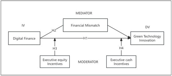 What remains less clear is how and under what conditions digital finance drives green technology innovation. Two issues stand out: First, while the positive association between digital finance and green technology innovation has been well established, the underlying mechanisms remain systematically unexplored. Financing inefficiencies, including financial mismatch and elevated debt costs, have been widely recognized as obstacles to firm innovation, but their mediating role in the digital finance–green technology innovation relationship is poorly understood [11,12,13]. Second, governance arrangements influence innovation resource allocation, yet whether executive incentives condition digital finance effectiveness remains unclear. For example, research on Chinese firms indicates that equity-based compensation can lengthen managerial horizons and encourage exploratory green R&D [14,15]. Whether these arrangements amplify or mute the effects of digital finance, however, remains largely unexplored.