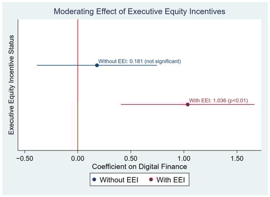 Executive equity incentives (EEI) refer to stock-based compensation arrangements that tie executives’ wealth to long-term firm value and are distinct from cash-based incentives [15]. However, the impact of digital finance on green technology innovation may be contingent on executive incentive structures. While digital finance increases resource availability for green innovation, whether these resources yield substantive green outcomes depends on managers’ willingness to undertake long-term, uncertain projects. Agency theory suggests that, without proper incentive alignment, enhanced financing access may not translate into innovation investments [40].