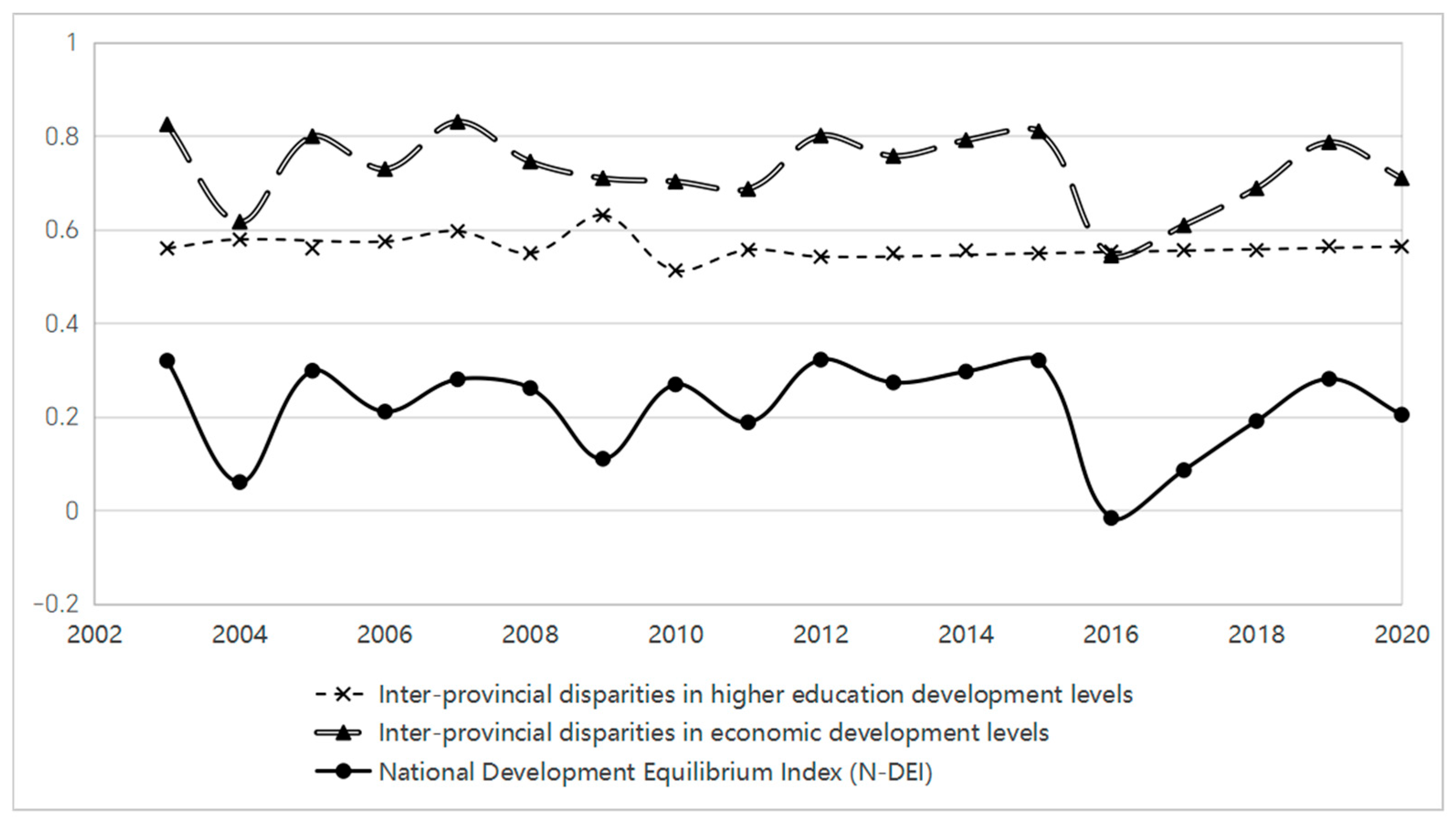 This section analyzes the temporal evolution and structural characteristics of inter-provincial equilibrium in higher education development in China from 2003 to 2020, based on provincial-level data and the calculated values of the National Development Equilibrium Index (N-DEI).