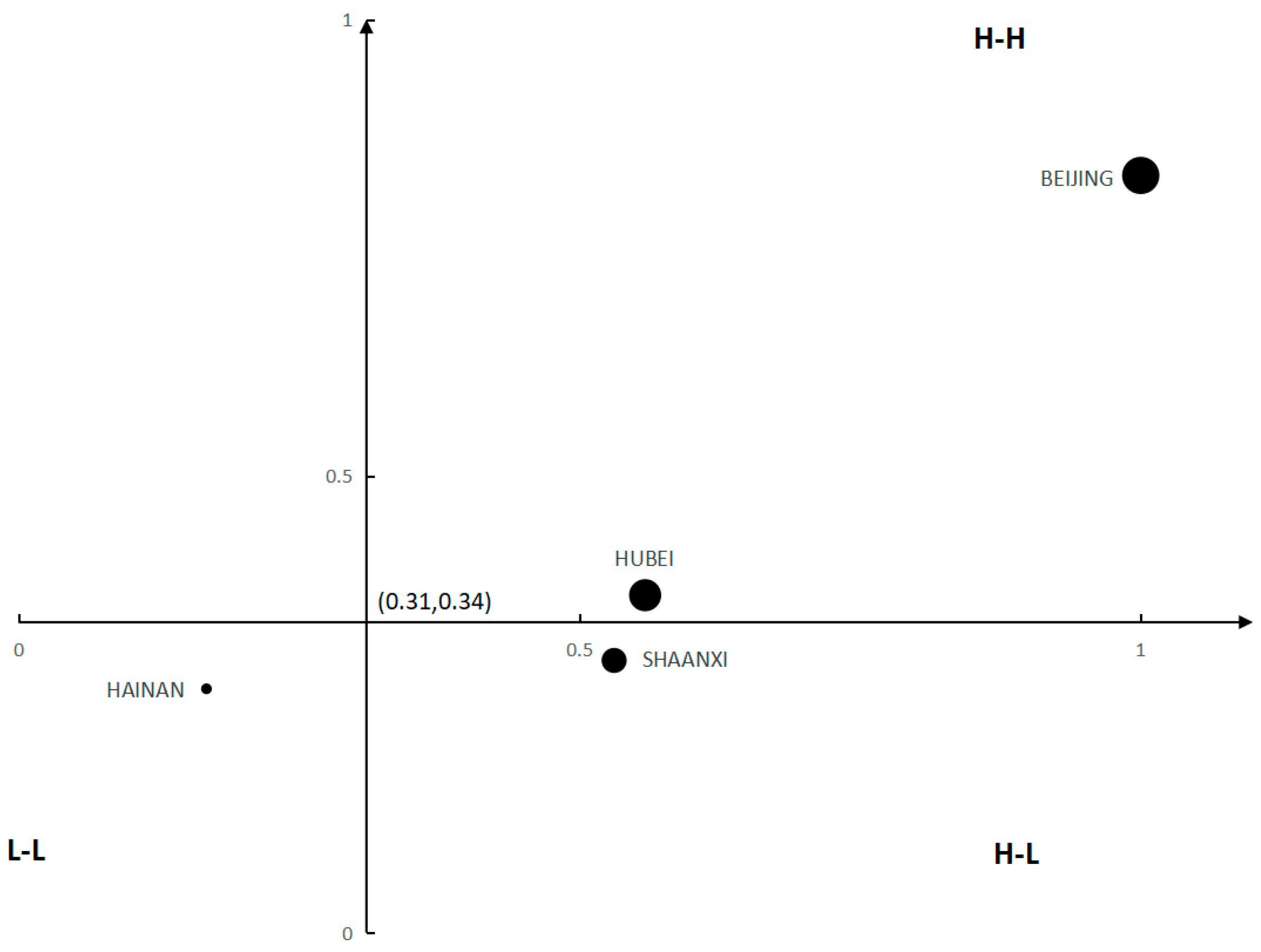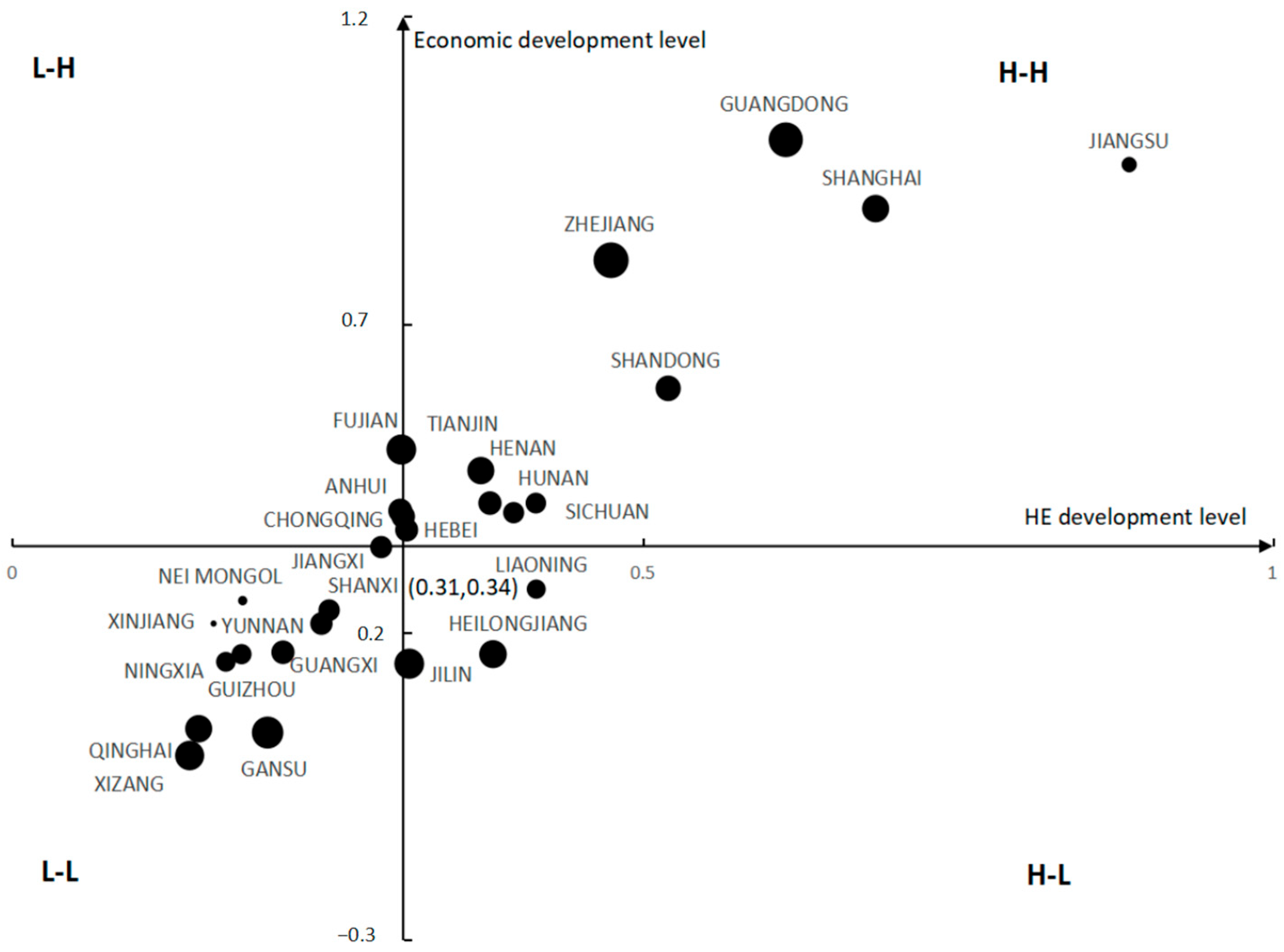 Figure 4 present a quadrant display using the sample medians of the higher-education (x) and economic (y) indices (0.31 and 0.34) as descriptive cut-offs. The sole purpose of these medians is to classify provinces as “higher” vs. “lower” on each axis for comparative positioning across the national sample; a practical advantage is that the resulting classification is not overly concentrated in a single group.
