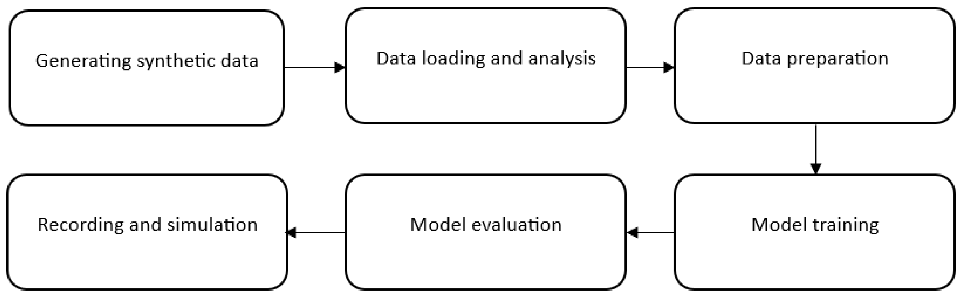Figure 2 shows a general scheme of the simulation process. The schema includes a sequence of steps from synthetic data generation to model evaluation and storage, creating a comprehensive DDoS investigation cycle. The schema covers all the key stages of machine learning, from data generation to model evaluation and storage. This process is in line with the standards in the scientific literature [