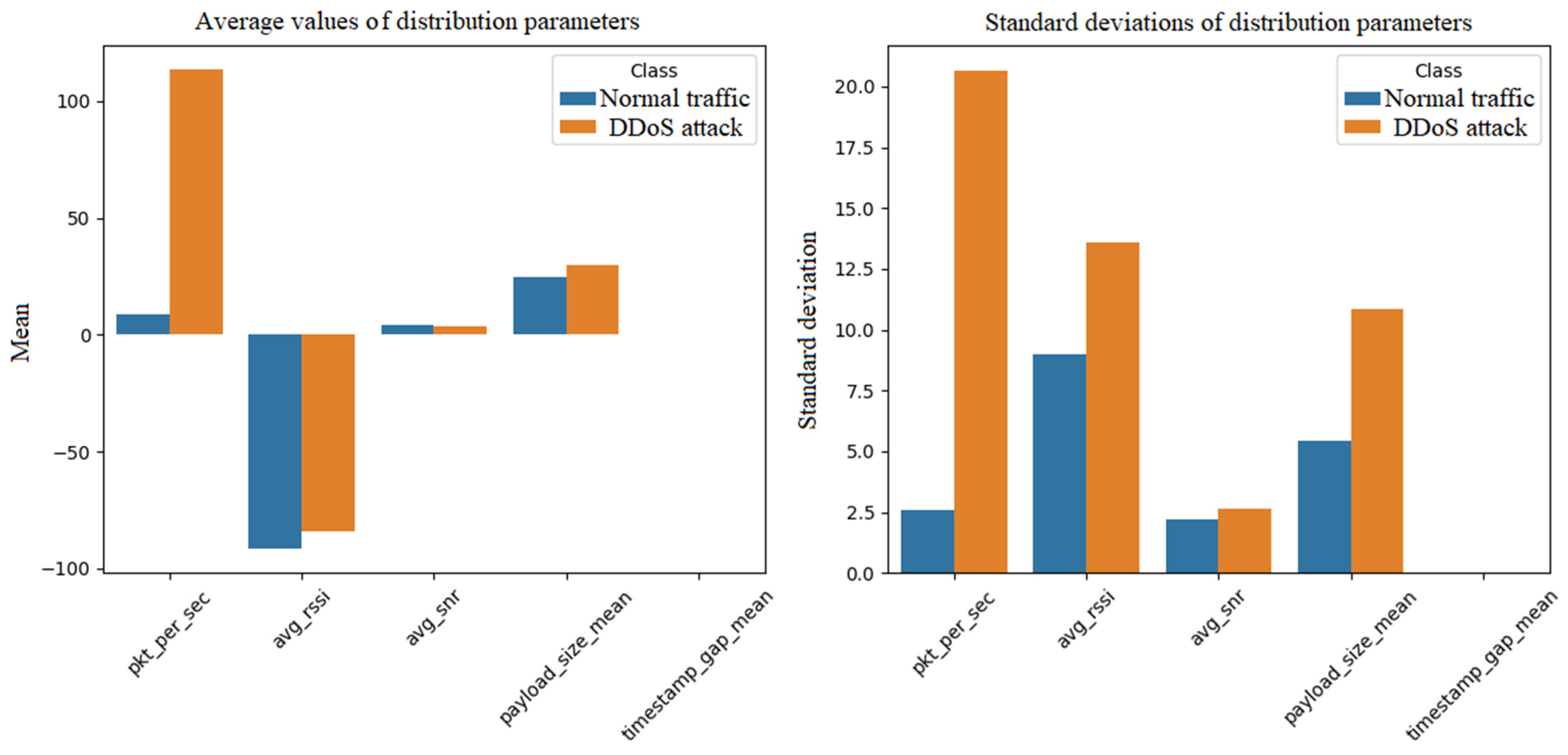 Figure 4 provide a visual comparison of the distribution parameters for normal network traffic and DDoS attacks, which is crucial for understanding the differences between these categories. For the average values of the distribution parameters in