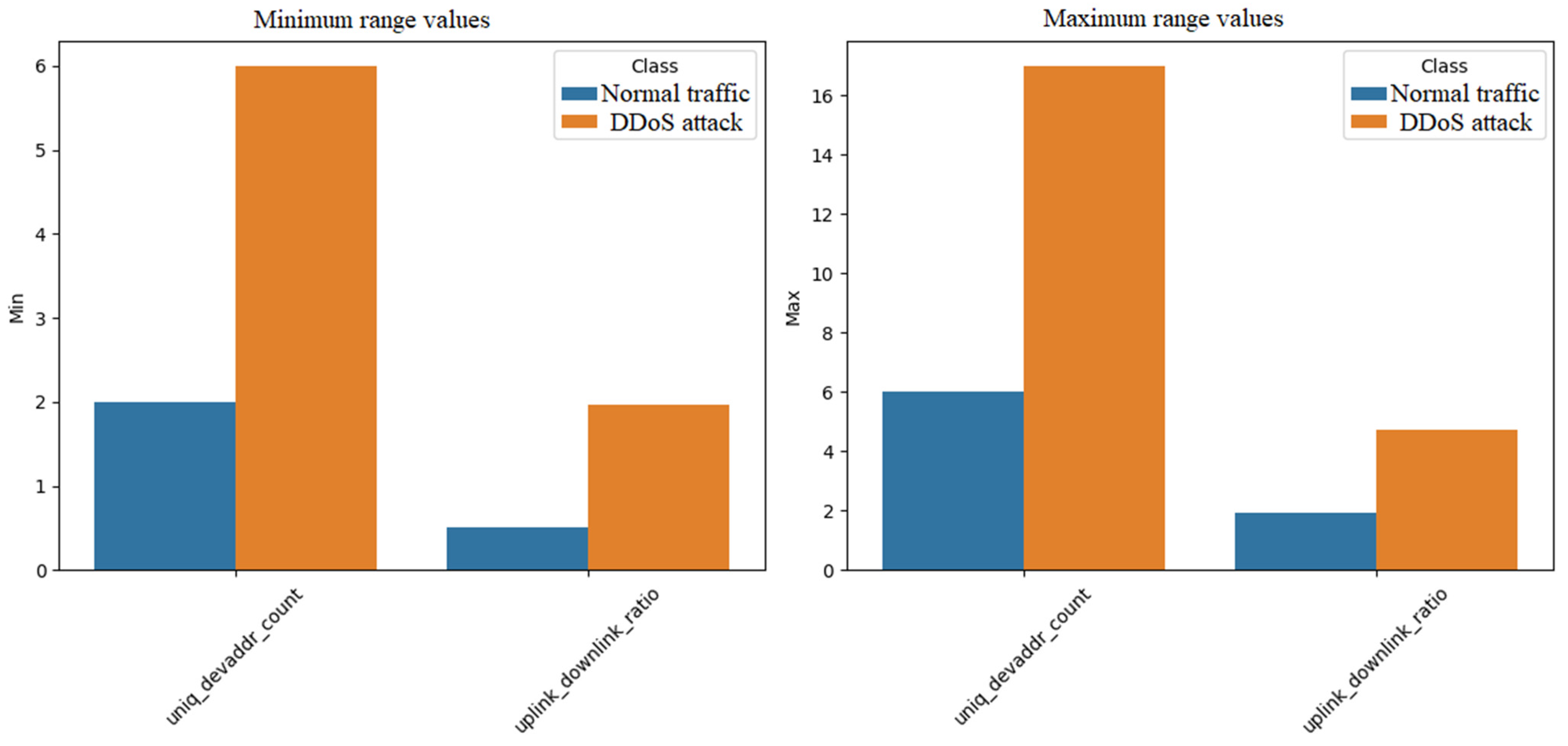 Figure 4 shows the second set of plots for the minimum and maximum values of the synthetic data parameters. As above, the figure consists of two sub-graphs. The left subgraph is a bar graph showing the minimum values for two characteristics: the number of unique device addresses (uniq_devaddr_count), and the ratio of traffic up to traffic down (uplink_downlink_ratio), broken down into normal traffic and DDoS attack.