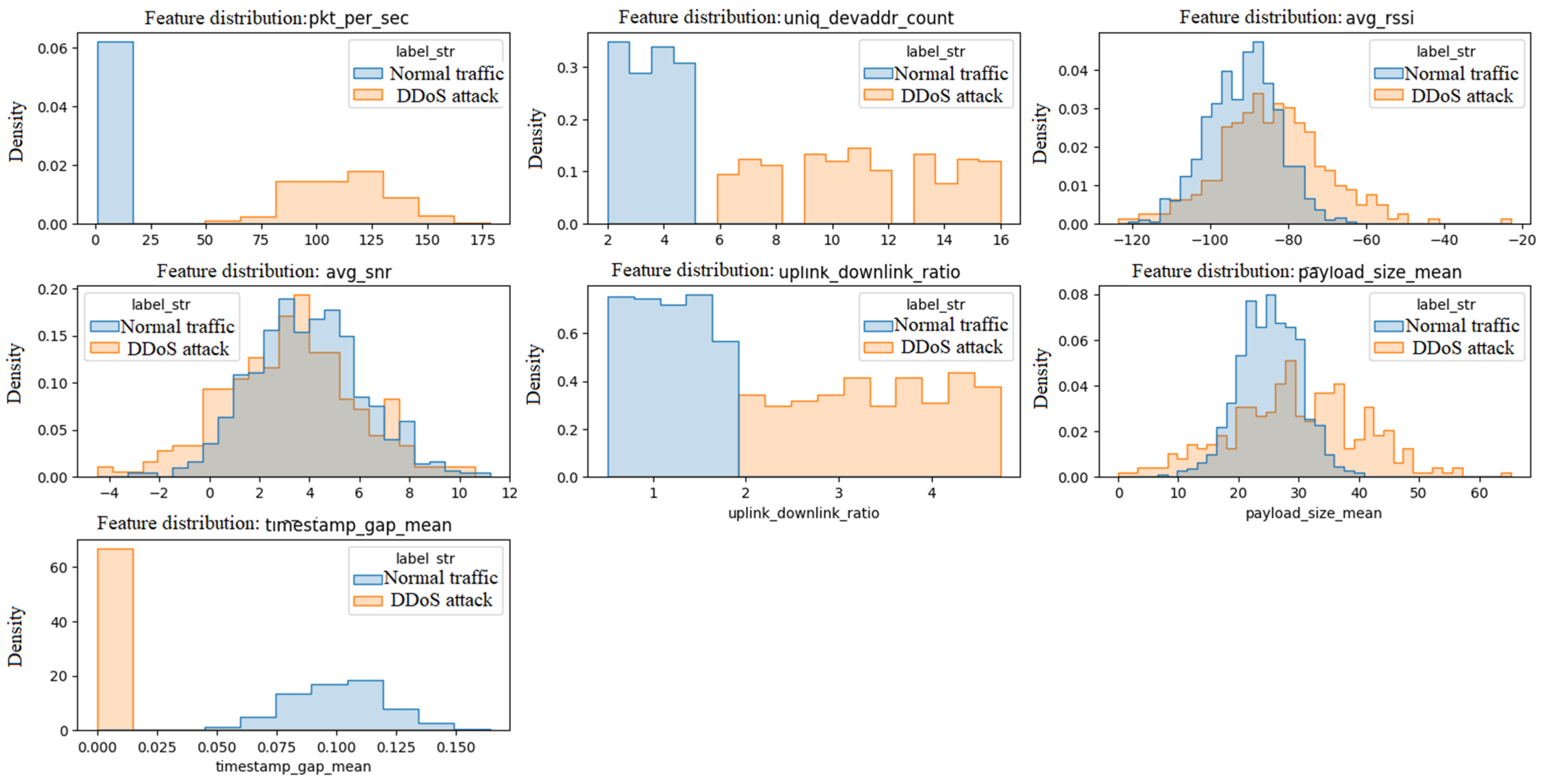 Figure 5 shows the histograms for the values of seven characteristics (number of packets per second ‘pkt_per_sec’, number of unique device addresses ‘uniq_devaddr_count’, average signal strength ‘avg_rssi’, average signal-to-noise ratio ‘avg_snr’, uplink/downlink ratio ‘uplink_downlink_ratio’, average payload size ‘payload_size_mean’, average time difference between packets ‘timestamp_gap_mean’) for both classes, with colors that distinguish normal traffic (e.g., blue) from DDoS attacks (e.g., red).