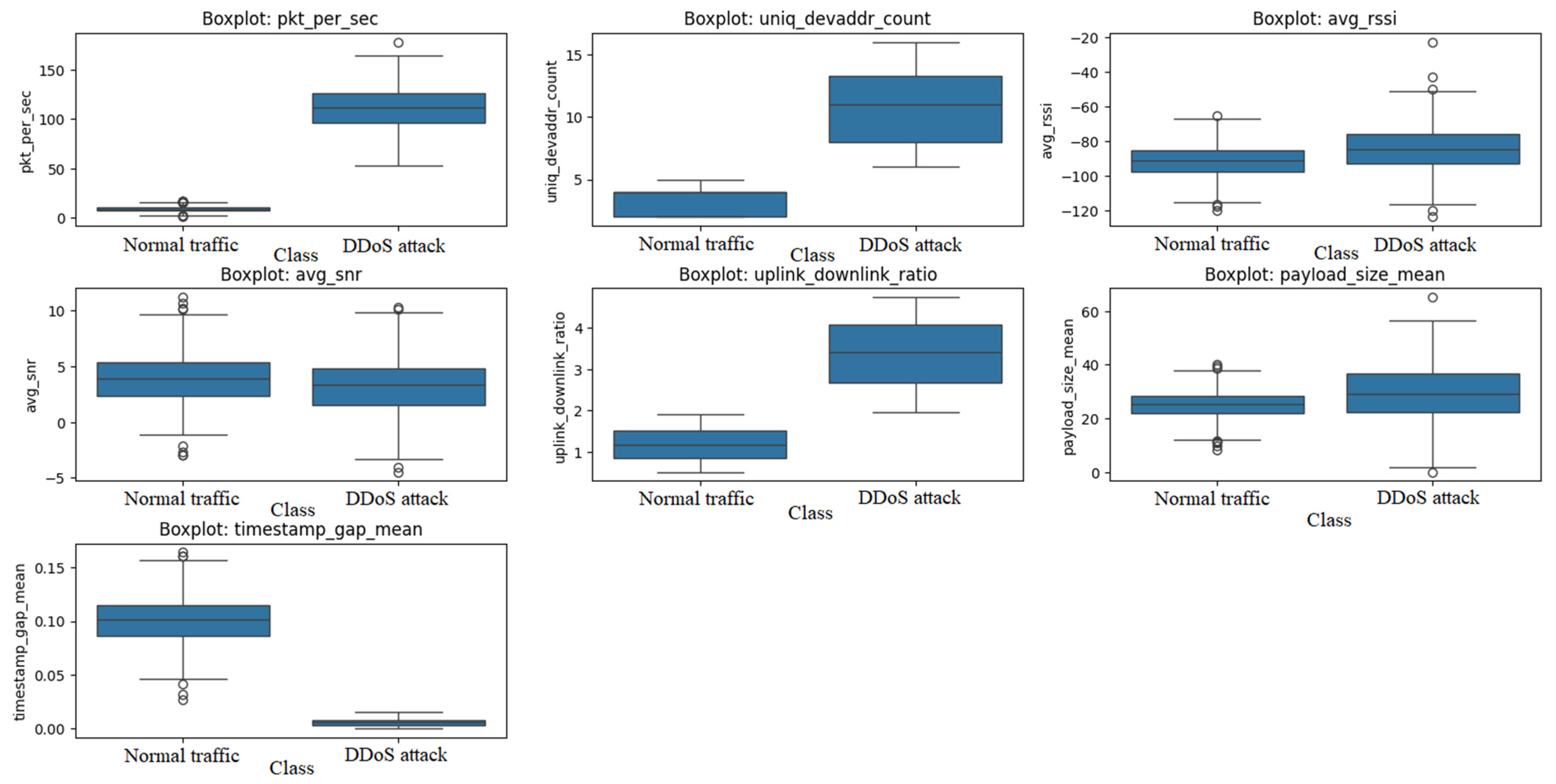 Figure 6 shows boxplots showing the distribution of feature values for both classes. The median of the ‘pkt_per_sec’ trait for attacks is much higher (e.g., ~100 vs. ~10), with a wider spread and more outliers, reflecting the variability in traffic volume. Higher median feature ‘uniq_devaddr_count’ for attacks (e.g., ~10 vs. ~4), with a broader range, indicating more devices in attacks. For the ‘avg_rssi’ and ‘avg_snr’ traits, similar medians are noticeable, but a greater spread for attacks, suggesting signal instability during attacks. For the ‘uplink_downlink_ratio’ trait, there is a higher median for attacks (e.g., ~3 vs. ~1), with a larger range, which is typical for outbound DDoS traffic. For the ‘payload_size_mean’ and ‘timestamp_gap_mean’ traits, attacks have a smaller median timestamp gap.
