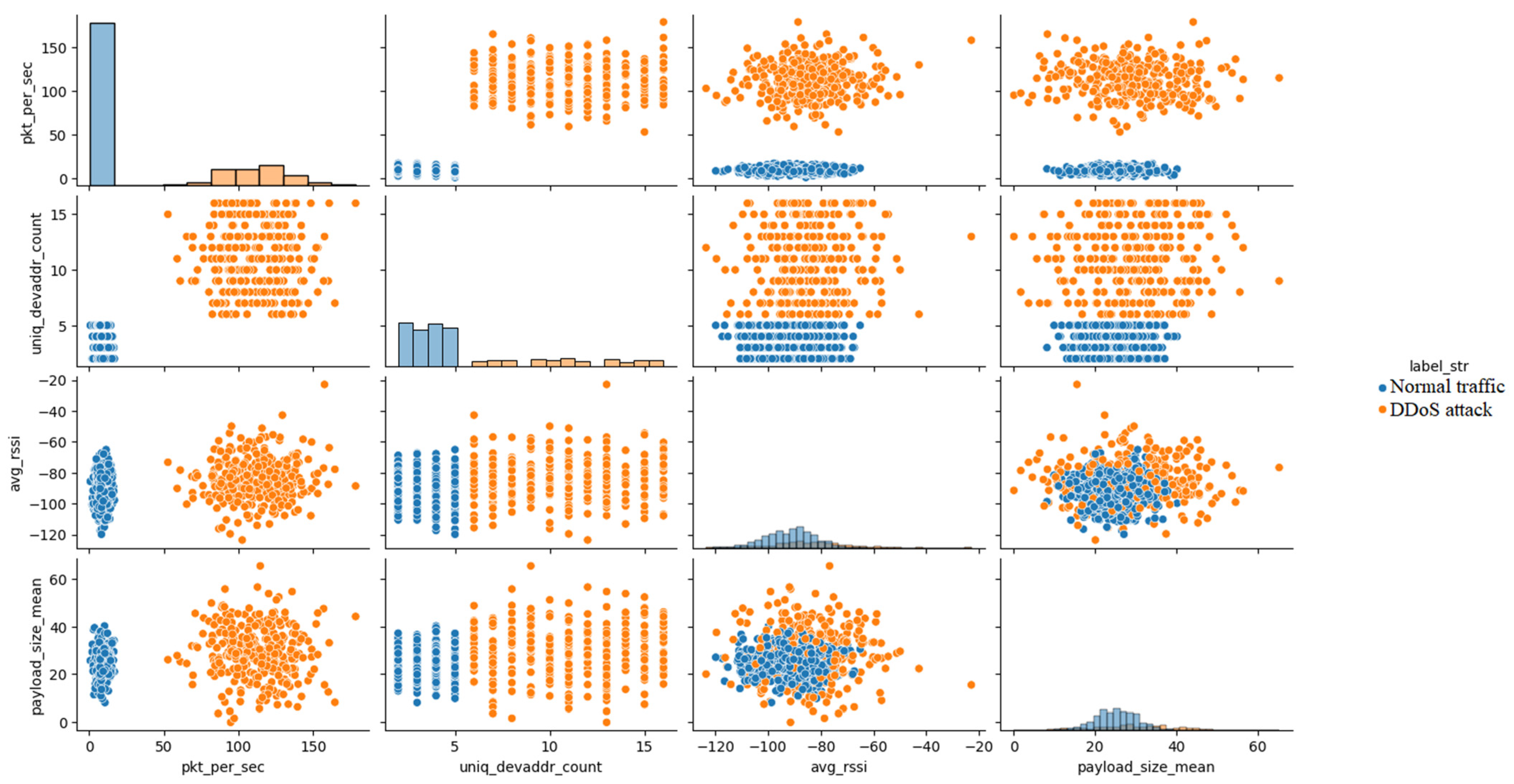 Figure 7 shows that features such as ‘pkt_per_sec’ and ‘uniq_devaddr_count’ separate classes well, suggesting that classification models can use these relationships effectively.