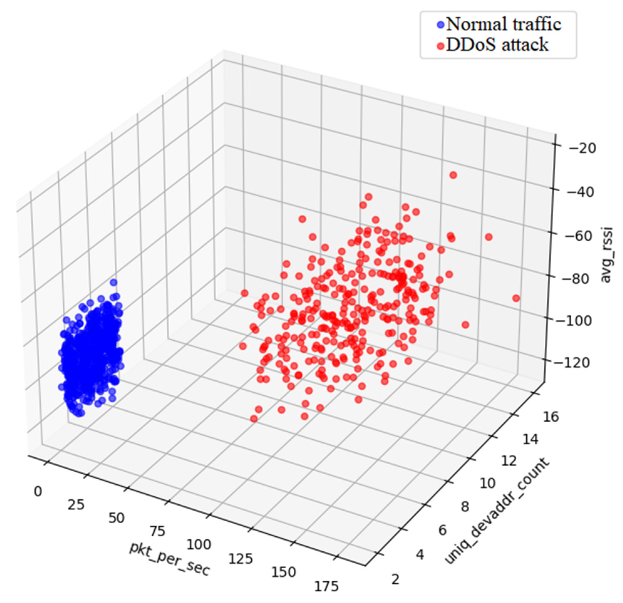 The 3D graph shows the distribution of data in a three-dimensional space of three selected features (e.g., ‘pkt_per_sec’, ‘uniq_devaddr_count’, ‘avg_rssi’), with points in blue for normal traffic and red for DDoS attacks. This graph allows you to assess whether there are clear clusters of data for normal traffic and attacks. If the points for attacks and normal movement are well separated in 3D space, it means that classification algorithms can distinguish them more easily, e.g., attacks can form a cluster with high values of ‘pkt_per_sec’ and ‘uniq_devaddr_count’.