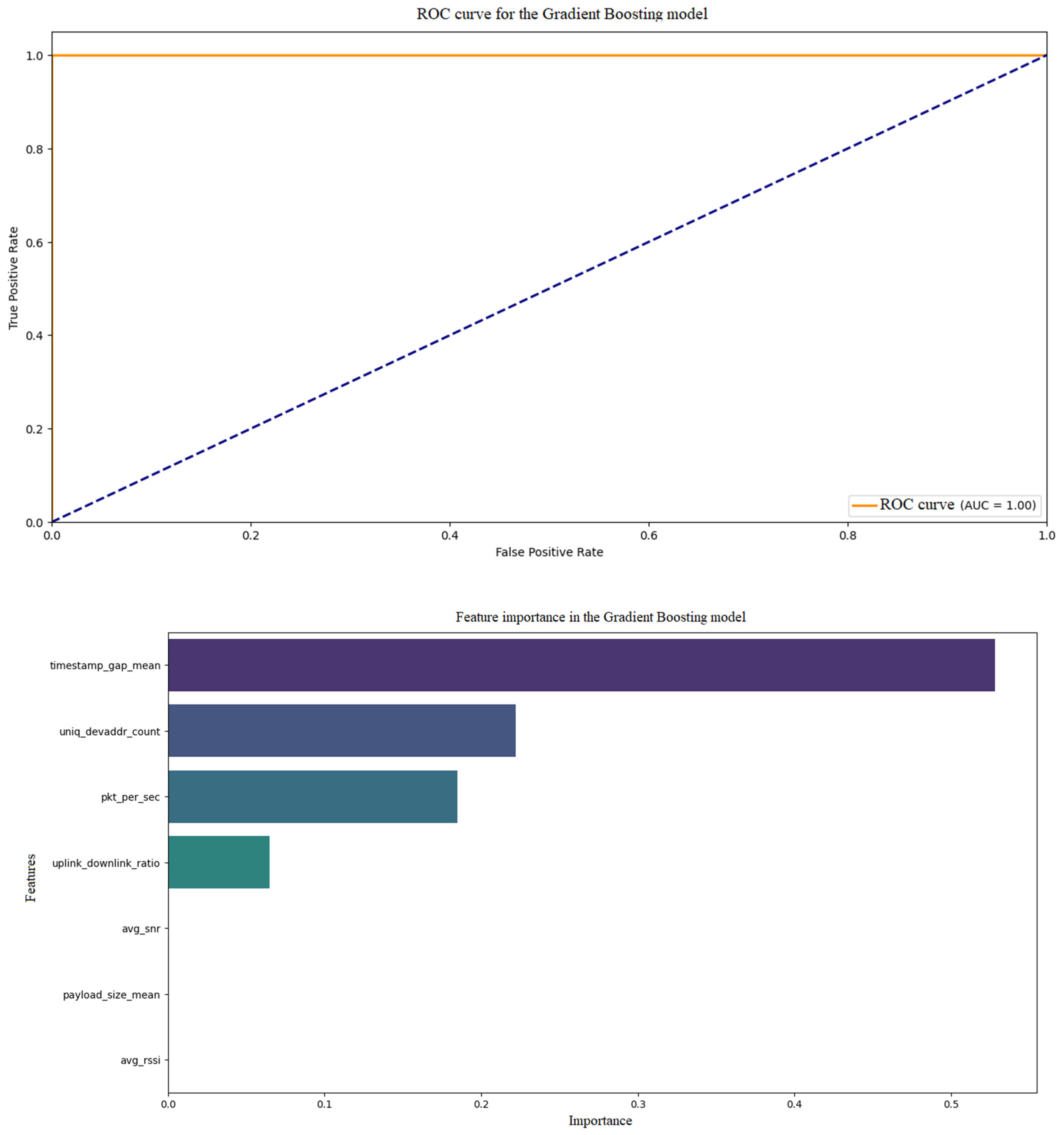 Figure 10, traits such as ‘pkt_per_sec’ and ‘uniq_devaddr_count’ dominate (e.g., 40% and 30% importance), confirming their key role in DDoS identification. The Gradient Boosting model does well, with high sensitivity and specificity of the data, and the key features are as expected (high traffic and number of sources).