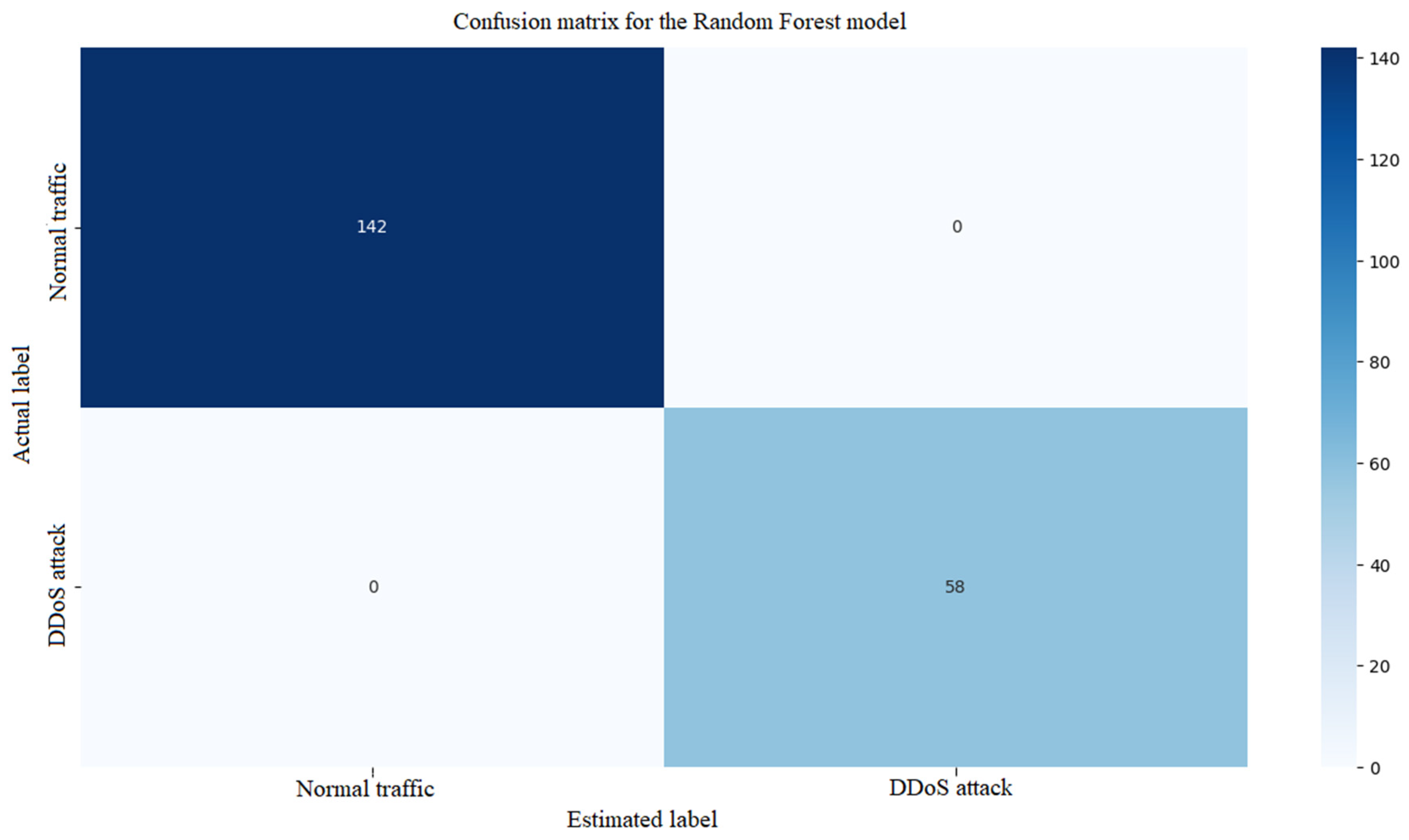 The confusion matrix shows the number of correct and incorrect classifications for each class (normal traffic and DDoS attack), presented on a heatmap with colors (e.g., blue for correct, red for wrong). The confusion matrix allows you to assess how well the model is at class recognition. A high number of false positives (normal traffic classified as an attack) can indicate that the model is overly vulnerable, which can lead to false positives. A high number of false negatives (an attack classified as normal traffic) can be critical because it means that attacks are not detected, which can have serious consequences for network security.