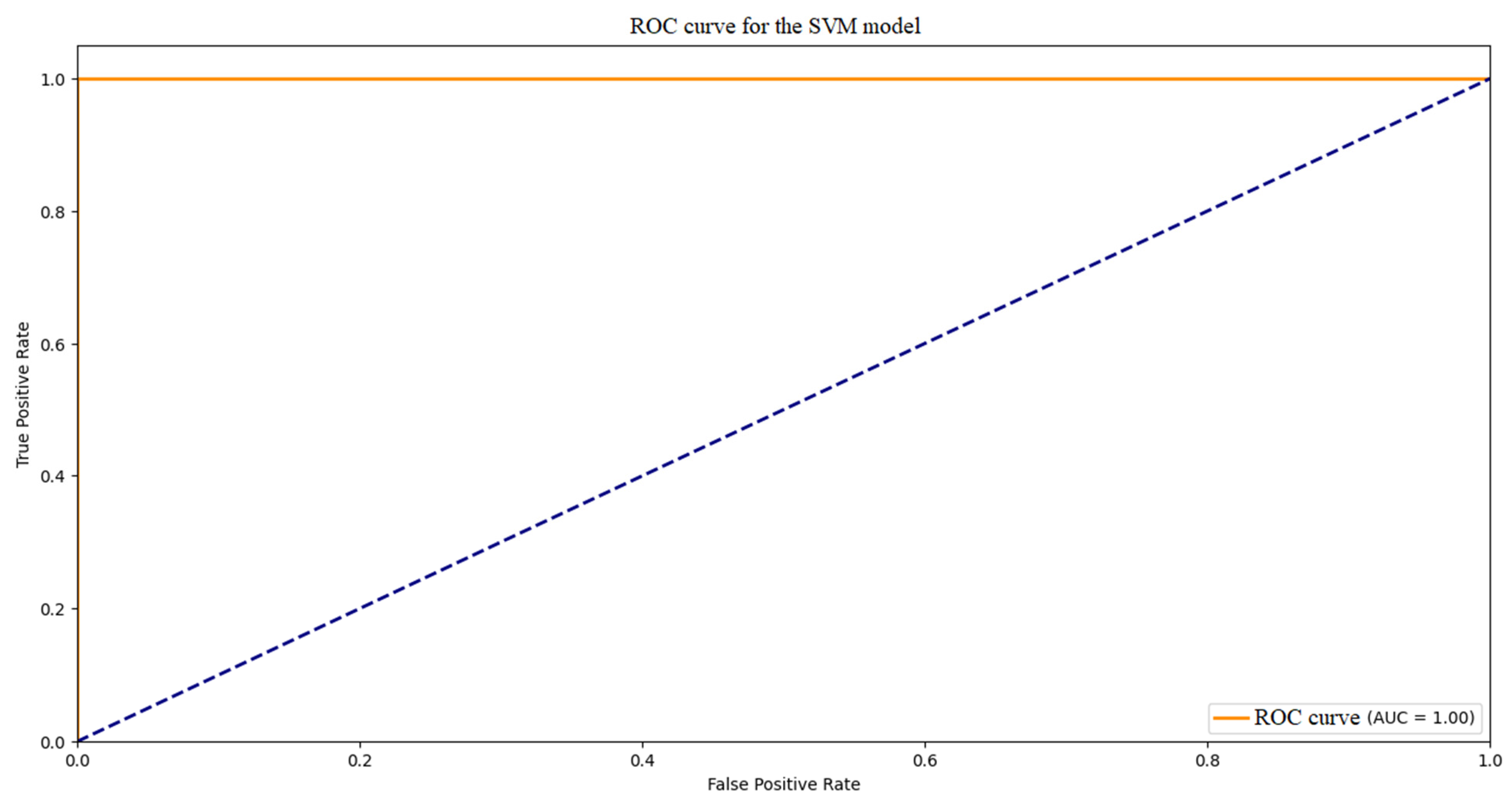 Figure 14 shows the ROC curve for the SVM (Support Vector Machine) model. The ROC curve has an AUC in the range of 0.80–0.88, indicating a good but slightly lower performance than Gradient Boosting or Random Forest. The curve is less smooth, suggesting sensitivity to data scattering. There is no feature importance chart because SVM does not provide this metric explicitly. SVM performs well, but is less effective at detecting all attacks, likely due to the difficulty of non-linear decision boundaries in the data.