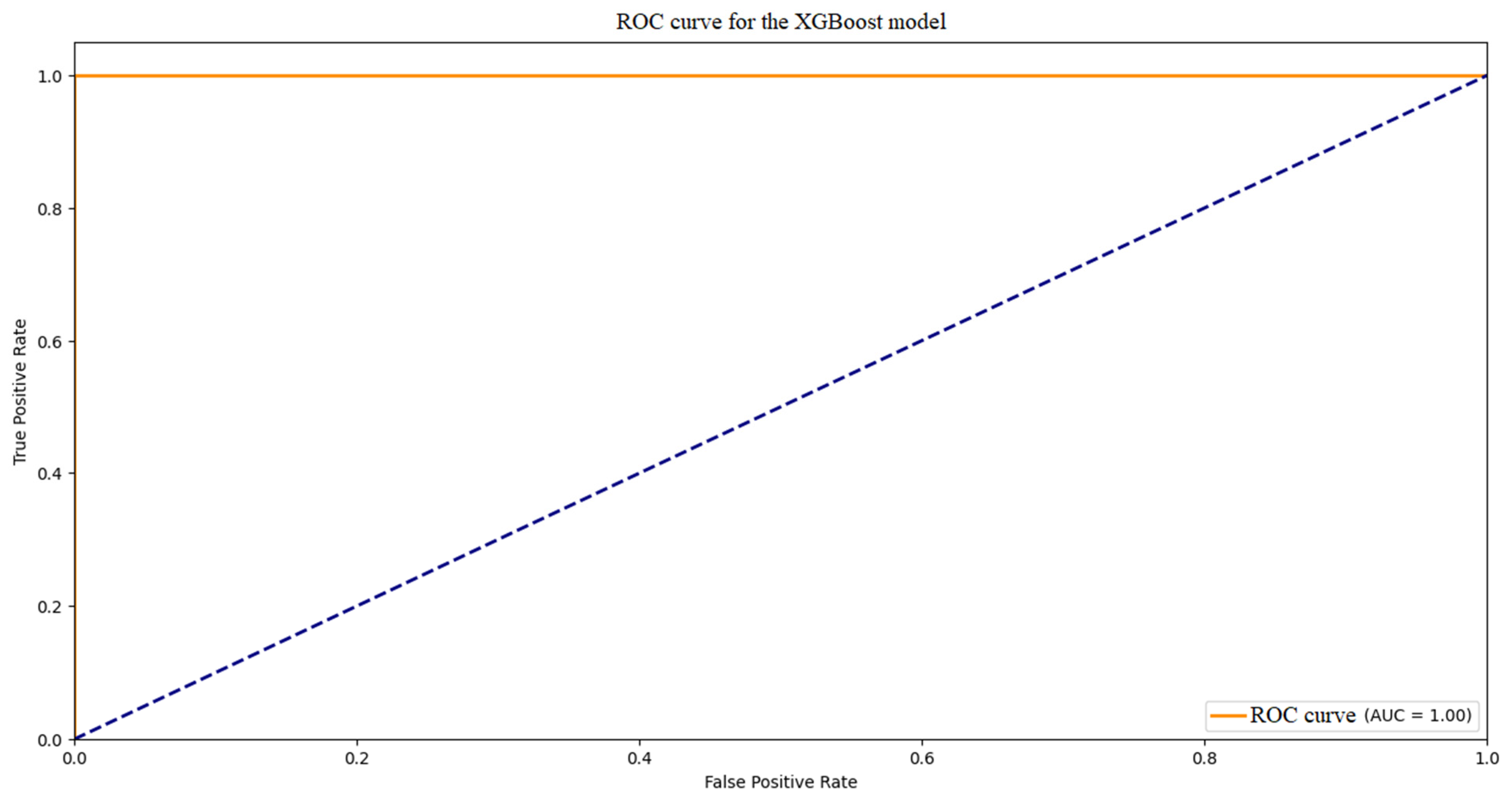 The Receiver Operating Characteristic (ROC) curve represents the ratio of true positives (TPR) to false positives (FPR) for different decision thresholds, shown in a graph with an orange line for the ROC curve and a blue dashed line for a random model. The ROC curve shows the quality of the model in distinguishing classes. The area under the curve (AUC) is a measure of overall performance. An AUC close to 1 indicates an excellent model, indicating a high ability to distinguish between normal movement and attacks. AUC = 0.5 denotes a random model, suggesting that the model does not perform better than a random selection. An AUC between 0.7 and 0.8 is considered good, and above 0.8 is considered very good, indicating the high performance of the model in practice.