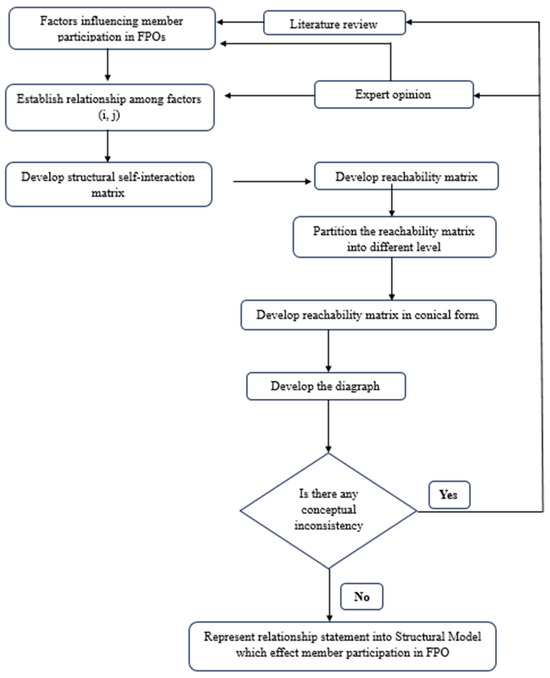 The ISM approach is analytical in nature and relies on the collective appraisals of a group for determining the presence and nature of relationships between factors. It derives the overall framework based on mutual interconnections among factors, as shown in Figure 1. As a modeling approach, it visually represents associations between the elements through a structured digraph. This helped to clarify relationships that exists between the factors that influenced members to join in millet FPOs and the directions of these relationships. In order to create a directed graph and hierarchical structure for the selected factors, the methodologies developed by Warfield for graph theory and Boole for algebra were adopted. These methodologies were implemented in a man–machine interaction mode, utilizing theoretical, conceptual, and computational leverage [32,33]. The operational procedure of ISM employed for this study is as below: