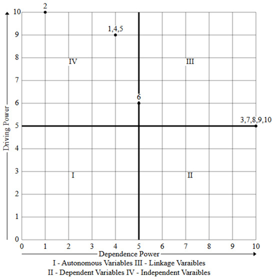 A conical matrix was produced when the factors in the final reachability matrix were clustered in the same level across the rows and columns. A total of ‘1’ in the factor rows was used to determine its drive power, while a total of ‘1’ in its columns was used to determine its dependence power [37]. The drive power and reliance power rankings were then determined by allocating the highest ranks to the components with the highest values in its rows and columns, respectively.