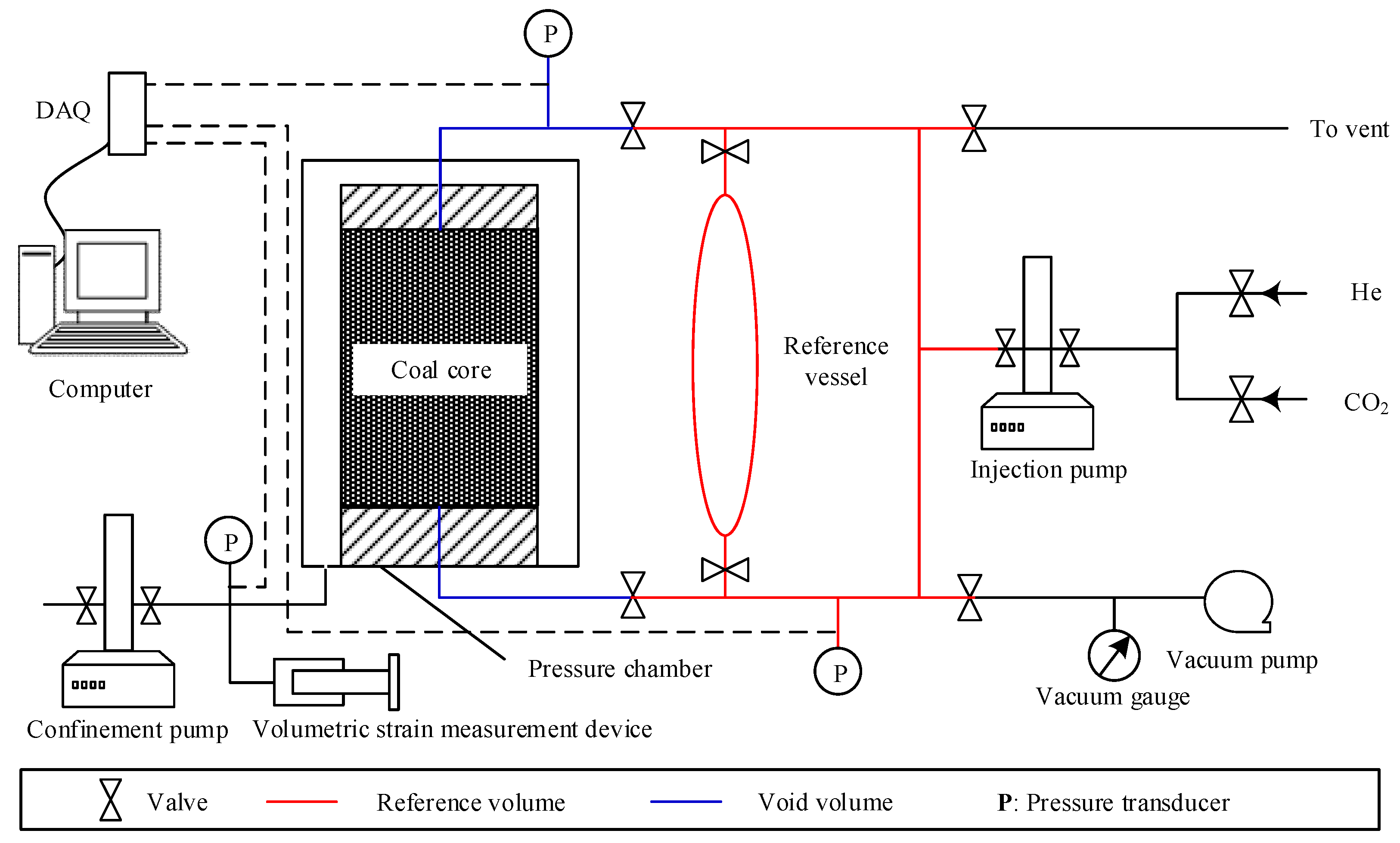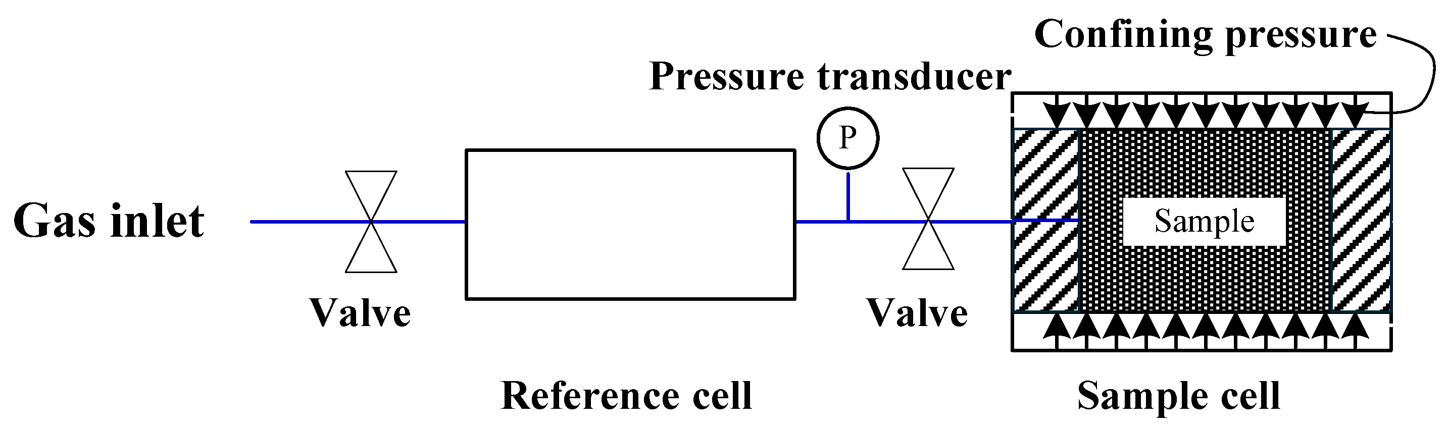 - Constraint 2 (Constant volume): The total volume of the confining fluid (used to apply confining pressure) and the specimen was kept constant throughout the experiment. Under this condition, the volume of the confining fluid varies in response to gas sorption-induced deformation of the coal sample, which in turn alters the confining pressure. This setup ensures that variations in the experimental system are primarily driven by internal pressure fluctuations resulting from adsorption, rather than active regulation of the confining fluid volume. To establish this condition, the confining pressure was initially raised to the target value using the confinement pump. The valve between the confinement pump and the pressure chamber was then closed to disconnect the two systems. During the experiment, although adsorption-induced deformation of the coal sample resulted in fluctuations in confining pressure, the total volume of the confining fluid and the specimen was strictly maintained.