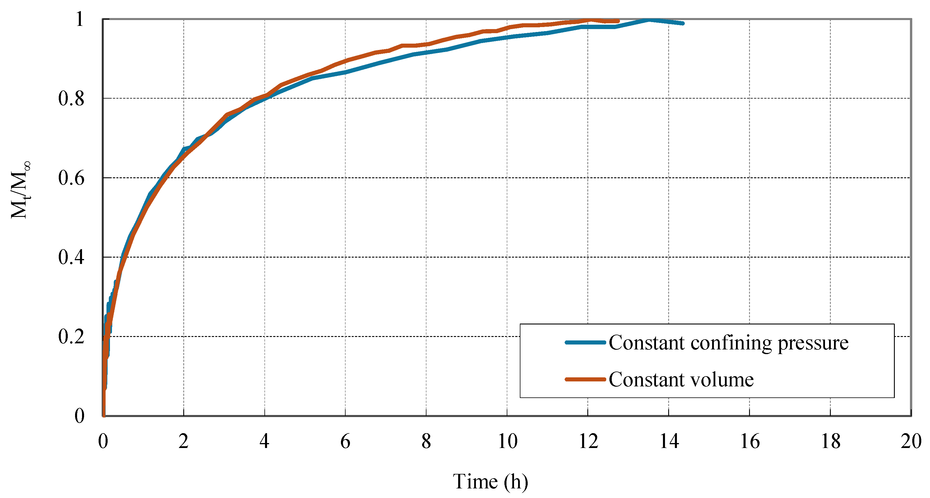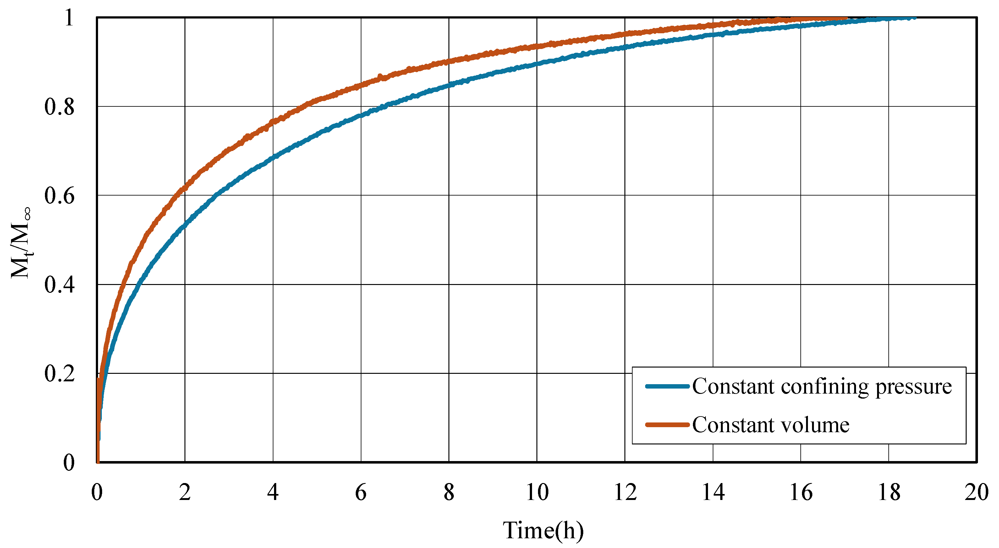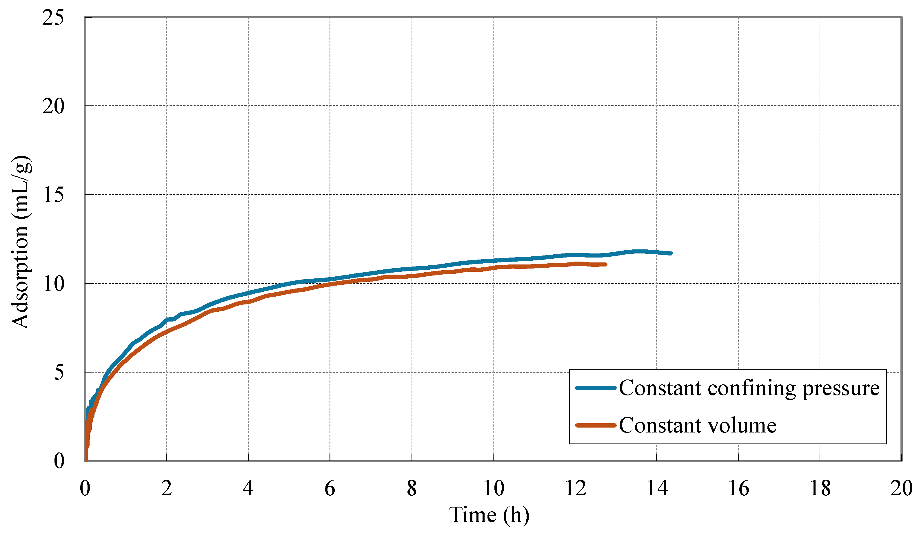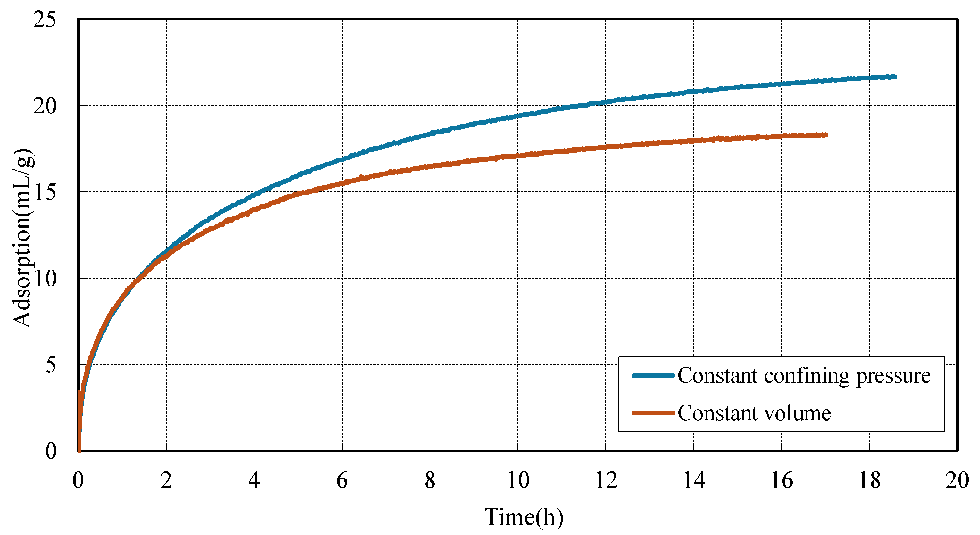 - Stress constraints modulate adsorption behavior and kinetics. Under constant confining pressure, coal exhibits consistently higher adsorption capacities compared to constant volume conditions. This enhanced adsorption is attributed to the ability of the coal matrix to swell volumetrically, which helps preserve pore accessibility and promotes continuous gas uptake. In contrast, under constant volume constraints, the restriction on expansion leads to a rapid buildup of internal stress. This stress accumulation not only hinders further adsorption but also accelerates the approach to saturation. Consequently, although initial gas uptake occurs more rapidly under constant volume conditions, early saturation is reached due to the limited capacity for matrix expansion.