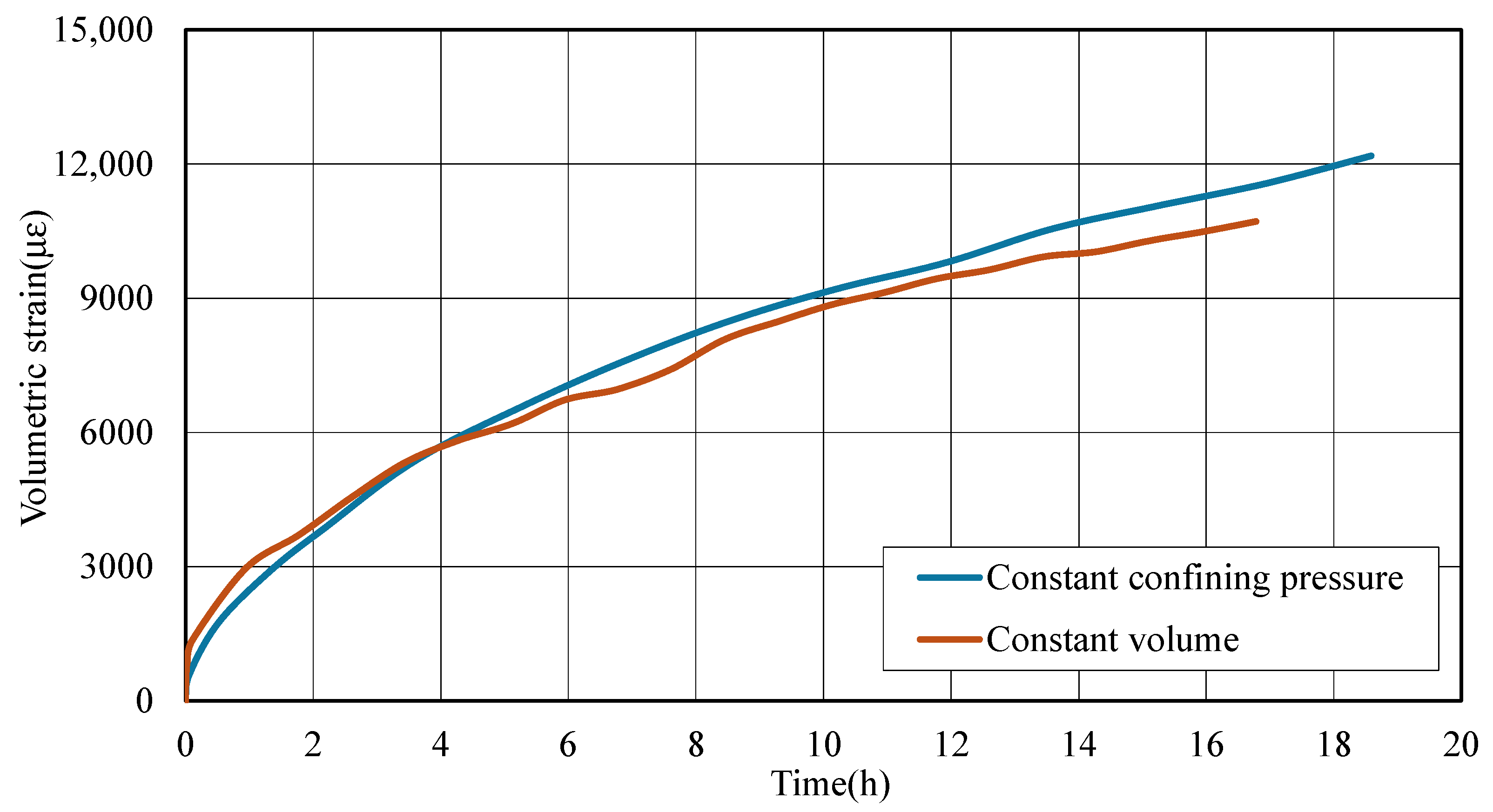 - Constraint 1 (Constant confining pressure): The confining pressure was maintained at a constant value throughout the experiment to simulate a stable external stress environment. This setup allowed the coal sample to undergo sorption-induced deformation without the need for external pressure adjustments. To achieve this condition, the target confining pressure was first applied to the sample using the confinement pump. Subsequently, the valve connecting the confinement pump and the pressure chamber was closed to isolate the system. During the entire adsorption test, the confining pressure was kept constant by fine-tuning the volumetric strain measurement device.