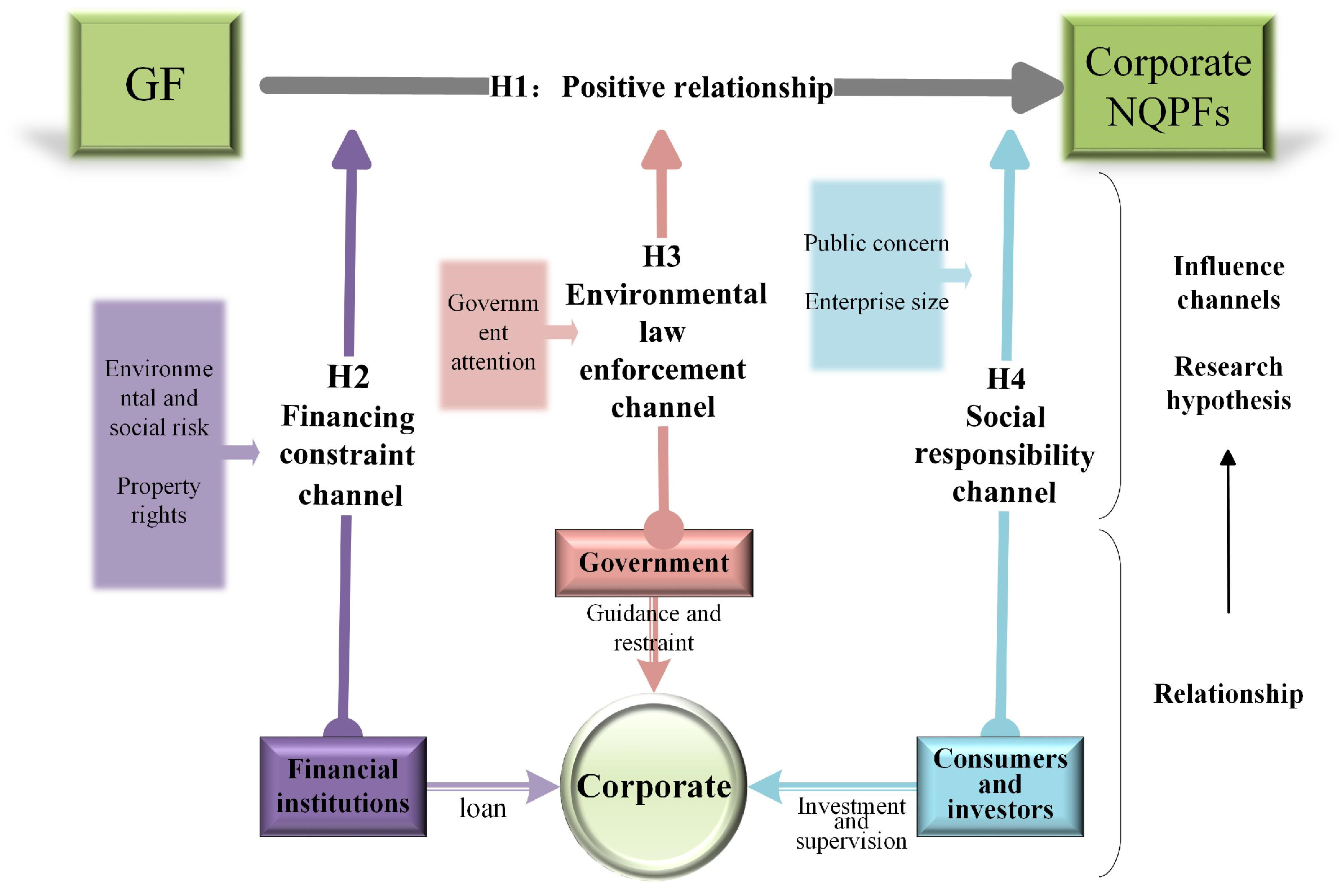 These results demonstrate that alleviating financing constraints can enhance the positive relationship between GF and corporate NQPFs, thereby confirming Hypothesis H2. Furthermore, the significance of the Chow test (in the context of panel regression analysis, the Chow test is employed to examine whether there are significant differences in model parameters across different groups) indicates that higher environmental and social risks faced by firms are associated with stronger financing constraints, which impedes the cultivation of corporate NQPFs. Concurrently, the statistically insignificant coefficient of GF in Column (4) reveals the challenges faced by non-state-owned enterprises during the green transition. Influenced by their industrial attributes, non-state-owned enterprises are often smaller in scale. Due to a comparative lack of stable collateral, established credit histories, and implicit government guarantees, many non-state-owned enterprises are unable to translate policy incentives into innovation momentum as effectively or efficiently as their state-owned counterparts. Therefore, achieving the green transformation of non-state-owned enterprises requires more tailored supportive policies rather than relying solely on conventional credit constraints or incentives.