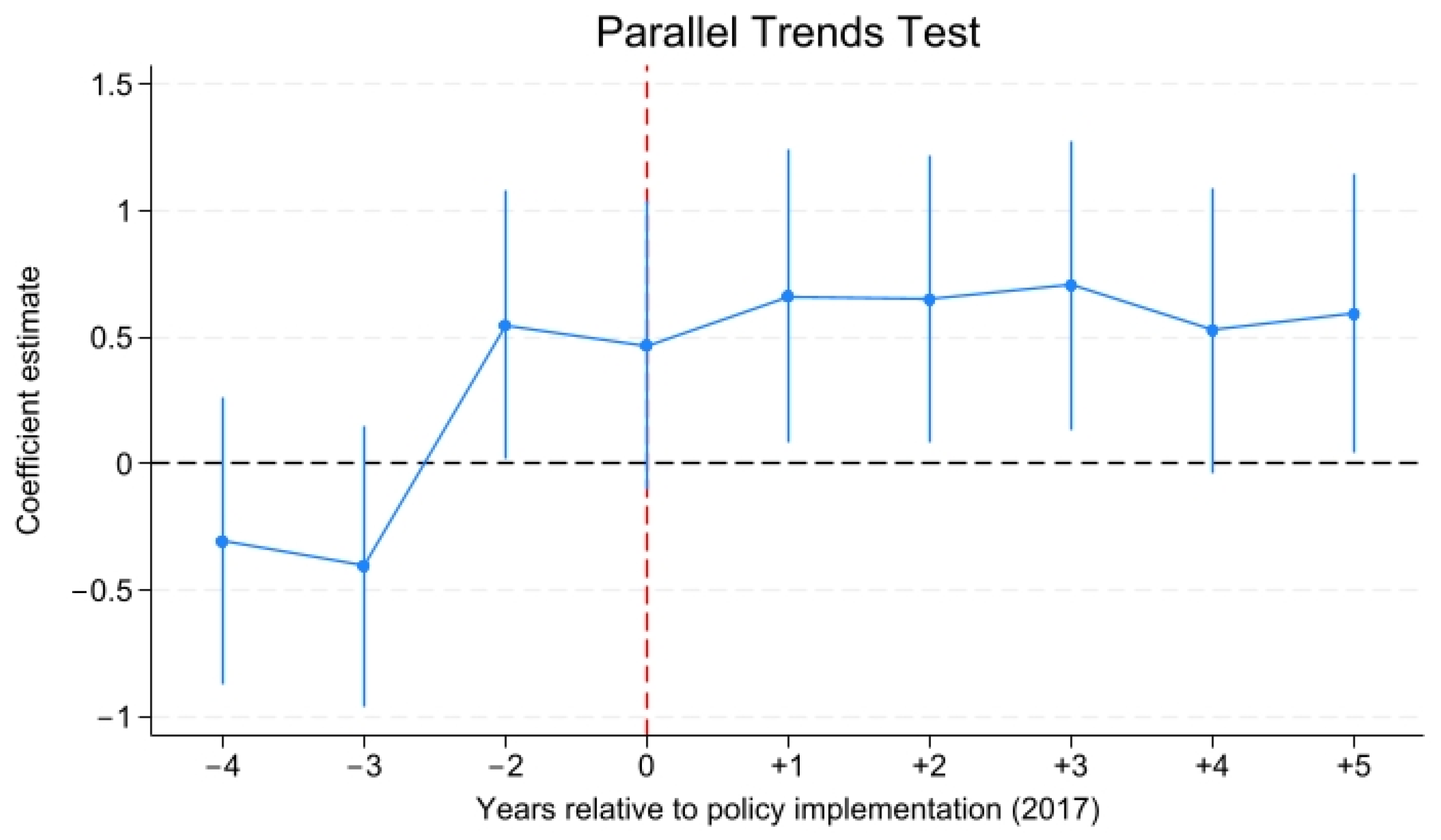 Figure 2. There is no significant difference between the estimated coefficients of dummy variables in each period before the implementation of the policy and 0, indicating that the experimental group and the control group met the conditions of parallel trend before the policy impact.
