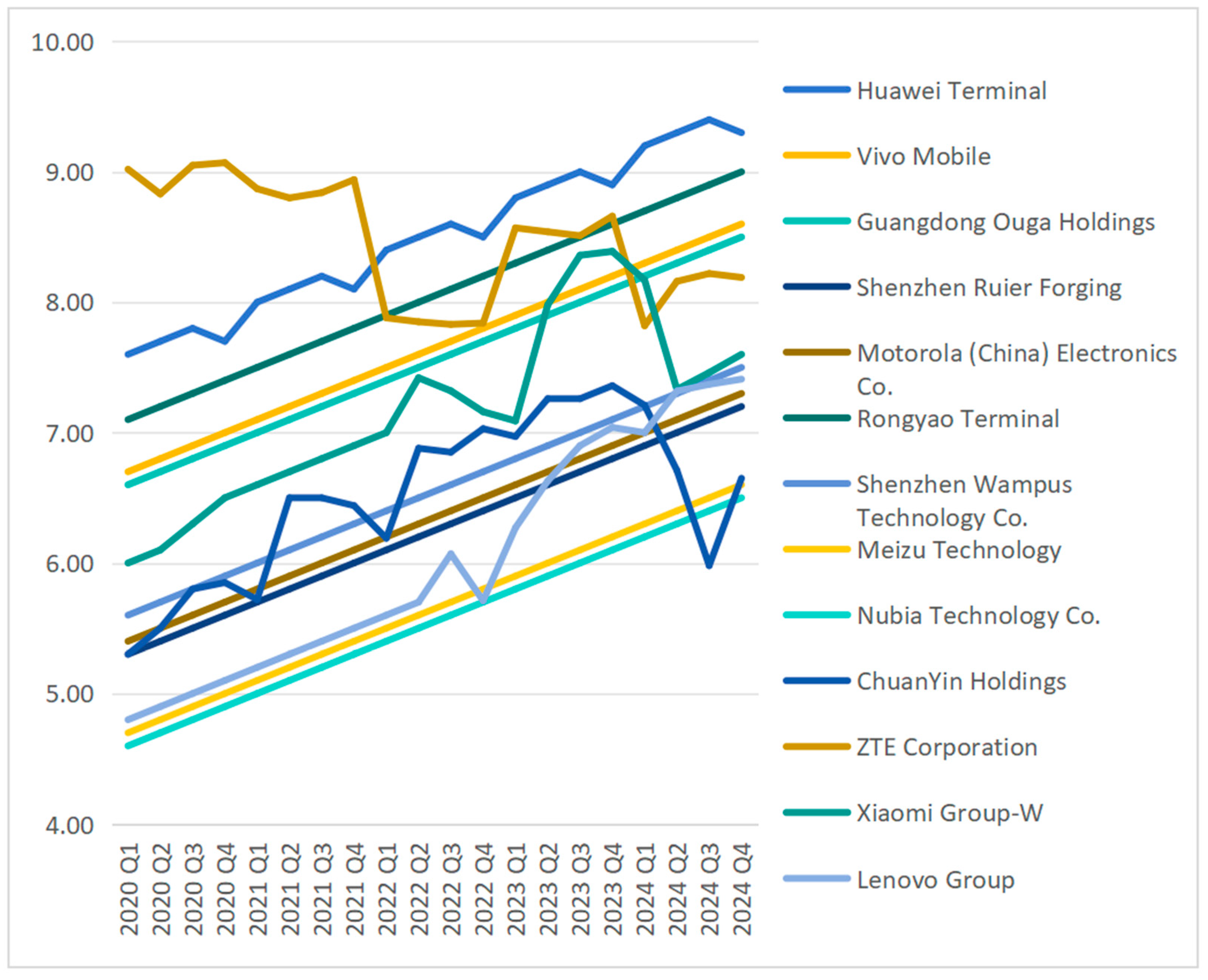 Cell Phone Model | Affiliated Corporation | Year | Profit Decline Rate Due to Involutionary Competition | Corresponding Corporate Quarterly ESG Scores | Years Since Establishment | Industry Lerner Index | Corporation Size |