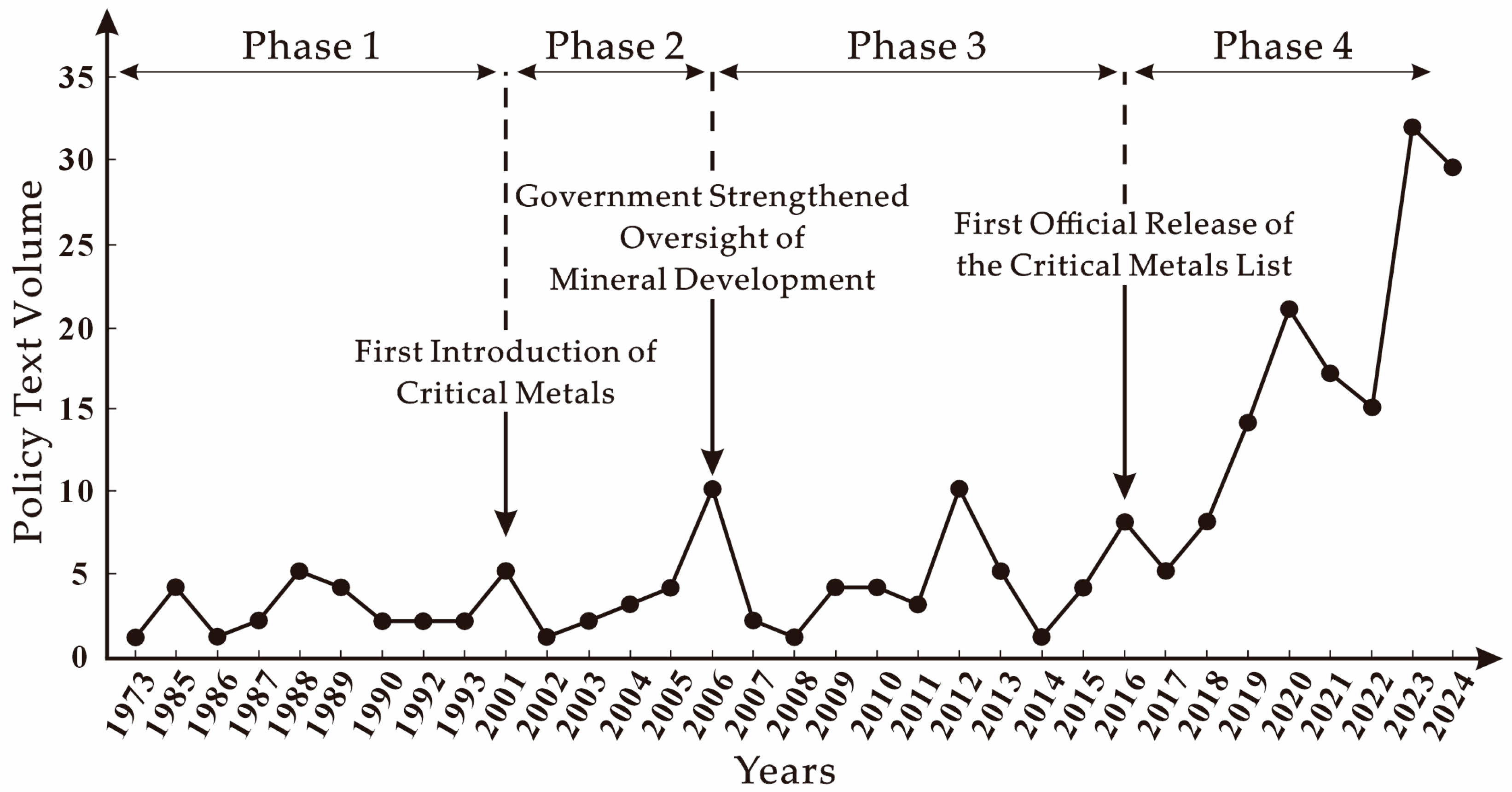 (4) Phase 4 (2016–Present): A pivotal 2016 policy formally designated 24 strategic minerals (including 14 critical metals), initiating institutionalized governance. The 2021 “Mineral Exploration Breakthrough Initiative” prioritized critical metals exploration. This phase exhibits surging policy volume, expanding regulatory scope, and heightened strategic emphasis.