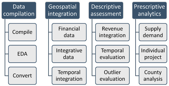 Afterwards, all the data sources that do not possess geospatial integration in their original format were integrated into parameters that are a good fit for the proposed framework, as indicated in the second activity of Figure 1. Attribute joints were performed among diverse databases to create relational models that expand the reach and capabilities of more limited data. Exploration and assessment of adequate joint attributes standardized and aligned them to create a good fit between the two systems being integrated. Geospatial joints were additionally applied through diverse resolution systems, integrating data that could create a good fit to maximize potential analysis. In this fashion, data was integrated with geography and temporal parameters, allowing for the proposed financial framework to be developed.