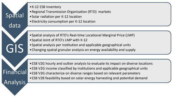Operationalizing the previously described framework involves the integration of spatiotemporal data into Geographic Information Systems (GIS) and data analytics processes, as presented in Figure 2. Data from public K-12 institutions in the US, provided by the National Center for Educational Statistics [33], were integrated in the process. From student enrollment and the proportion of students using school transportation, the number of school buses was determined by the institution. Real-time Locational Marginal Pricing (LMP) provided by the US Regional Transmission Organizations (RTOs) [34,35] was integrated into the system to ascertain potential revenue for each school, based on the number of ESBs and battery capacity. Spatiotemporal data for solar energy potential provided and electricity consumption data provided by the National Renewable Energy Laboratory [36], the Department of Energy [12,14], the Environmental Protection Agency [13,17], and Energy Star [16] were additionally incorporated in the system. In the second stage, shown in Figure 2, the data integrated in the first stage is overlaid to create spatial joints in GIS operations. These spatial joints allow us to ascertain the energy storage capacity for each school, the potential prices that may be obtained, the solar potential, and the demand of each school, community, county, and diverse spatial granular characterizations. The Financial Analysis section applies the integrated spatiotemporal data, which has been overlaid with diverse features in the GIS section. Open source QGIS software was applied to perform geospatial analysis, including integration of layers, spatial joins, and statistical analysis, and exported to be further explored in data analytics systems such as MATLAB and Excel. The potential revenue was calculated by applying the existing energy storage capacity and the price of hourly energy, as reported by RTOs. Evaluating the impact of outliers in all segments was found to create significant impacts in the potential ESB V2G revenue streams. Diverse ESB V2G financial models were developed by characterizing potential income under diverse geographical feature parameters.