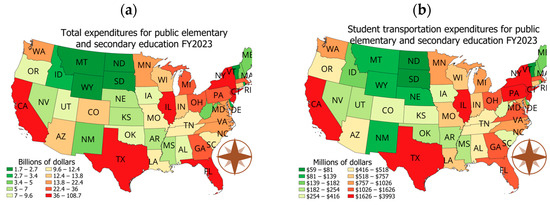 Public education in the United States represents a significant proportion of the Federal, State, and Local budgets. Public elementary and secondary education expenditures exceeded $818 billion for the Fiscal Year (FY) 2023, with 59% corresponding to instruction expenses and 37% to total support services [39]. Student transportation accounts for more than $33 billion yearly. Any savings or cost offsets for this transportation expenditure could be applied to provide schools with significant additional resources to support students. Figure 3 provides an outlook for the educational expenditures per state [39]. The significant variation per state reflects the number of students in each location and the diversity of the cost per student per state. For instance, California is home to more than 5.8 million K-12 students, with a total per student cost of $18,568, leading to more than $108 billion total education cost. Texas, with a similar 5.5 million K-12 students, has a total per student cost of $12,382, resulting in a total state education cost of $68.3 billion. On the student transportation expenditures, there is also significant variability in per-student expenses. Many eastern seaborne states, such as New York and New Jersey, spend more than $1000 per student, while states such as California, Texas, and Oklahoma spend less than $400 per student. This significant variability can be best explored and assessed by applying geospatial analysis, as proposed in this study.