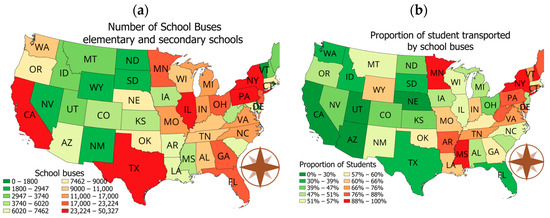 Although the US has more than half a million school buses to serve almost 50 million students, the variability per location is very significant [39,40,41,42,43]. For instance, three states have almost 25% of the school buses inventory in the nation, while 20 states only have 10%. To better assess and analyze the equipment inventory and its usage, Figure 4 provides the volume of school buses per state and the proportion of students, per state, who are transported using this equipment. Both parameters are critical to analyze the financial benefits that this study will provide. Some states, with a large number of students, such as California and Texas, have a low proportion of transported students, 19% and 31%, respectively. On the other hand, some states with a lower number of students, such as Mississippi and Minnesota, have a much higher proportion of transported students, 93% and 94%, respectively.