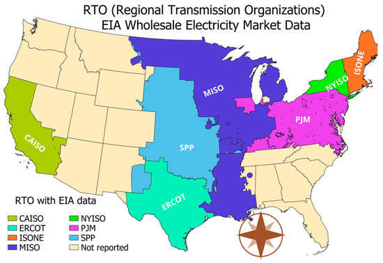 - EIA—U.S. Energy Information Administration. Wholesale Electricity Market Data by RTO. 2025. Available online: https://www.eia.gov/electricity/wholesalemarkets/data.php (accessed on 23 June 2025).