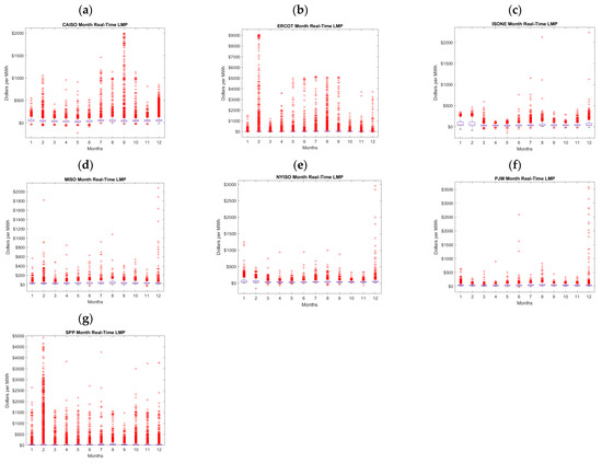 Box plot and whiskers presenting LMP for the hourly wholesale price of electricity, including outlier values, classified by months for each RTO (a–g) as indicated in each figure title. The red line indicates the median, the blue box indicates the interquartile range, and the red marks are outlier values.