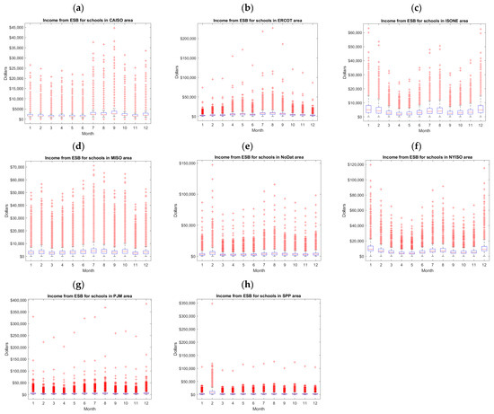 Box plot and whiskers presenting the ESB V2G income classified by months, including outlier values for each RTO (a–h) as indicated in each figure title. The red line indicates the median, the blue box indicates the interquartile range, and the red marks are outlier values.