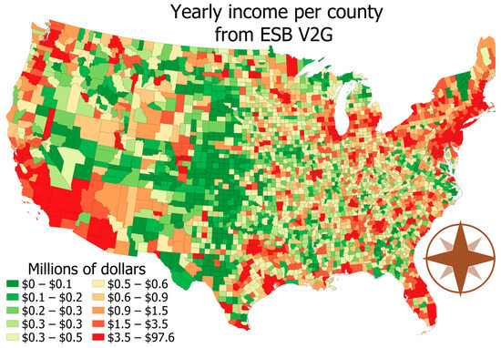 The map shown in Figure 15 indicates potential income from ESB V2G projects, considering one full battery discharge per day, with energy being provided from solar harvesting. The income is calculated from the highest daily Real-time LMP for the hourly wholesale price of electricity, in accordance with the RTO on which each school is located. The system assessed the highest daily hourly price at which schools’ systems will supply electricity. Potential income for the years in the period was averaged, and income per county was assessed, as shown in the map provided. This analysis showcases the wide geographical variability and distribution of the income that could be generated from this scheme and the relevance of using geospatial tools to make relevant decisions. Results indicate that 80% of the national income is generated by 23% of the counties, providing significant grounds for a Pareto analysis. Furthermore, 10% of the national income is generated by 9 counties, with 4 located in Texas, 2 in New York, and one each in California, Arizona, and Illinois, respectively. Additional Pareto results showcase that 20% of the income is generated by 1% of the counties, 30% by 1.9% of the counties, and 40% is comprised in 3.35% of the counties. On the other hand, counties generating lower income represent a significant proportion of the geography. For instance, 10% of cumulative EBS V2G income is generated in 60% of the counties. However, real annual revenue may be significant for the majority of the counties. For instance, 896 have an annual income higher than one million dollars, while 1145 counties (37% of the counties) have an annual income higher than $700,000. Furthermore, 1474 (47% of all counties) have an ESB V2G income higher than half a million dollars. This highlights the relevance of the potential income that each county may receive from these projects and the relevance of applying geospatial analysis to perform feasibility studies for each situation.