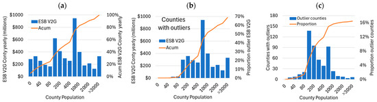 Bar charts for potential county revenue from ESB V2G, characterized by county population. (a) All counties in the contiguous US. (b) Counties with outlier revenue values. (c) Number of counties generating outlier revenue.