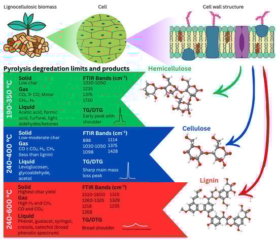 Thermogravimetric analysis (TGA) is widely used to assess the pyrolytic characteristics of biomass. This technique records the weight loss of samples as temperature increases, thereby providing valuable information on their thermal stability and decomposition behavior [25,26]. Several key parameters derived from TGA, including the comprehensive pyrolysis index, pyrolysis stability, and devolatilization index, are crucial for evaluating the energy potential and conversion efficiency of biomass feedstocks. The comprehensive pyrolysis index reflects the overall potential for bio-oil and gas production, whereas pyrolysis stability indicates the resistance of a material to thermal degradation [20]. The devolatilization index, in turn, provides insights into the rate of volatile release, which is particularly important for optimizing pyrolysis processes [27,28]. Zhai et al., (2016) [28] further highlighted the role of TGA in elucidating the kinetic mechanisms of biomass pyrolysis, offering a better understanding of devolatilization under different atmospheric conditions. For lignocellulosic biomass, the TGA profile typically follows three major stages: removal of moisture and light volatiles (<120 °C), decomposition of hemicellulose (220–320 °C), decomposition of cellulose and partial lignin degradation (315–400 °C), and extensive degradation of lignin above 450 °C [20,29,30]. During the thermal decomposition of biomass via pyrolysis, a variety of compounds are generated in solid, liquid, and gaseous forms depending on the temperature range and the distribution of lignocellulosic constituents. Considering the decomposition temperature windows of the main components, the corresponding FTIR absorption bands, and the characteristic TGA peaks, the properties of solid, liquid, and gas products were compiled from experimental literature data and are summarized in Figure 1 [31,32,33,34,35,36,37].