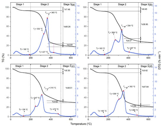 The analysis of thermogravimetric (TG) and derivative thermogravimetric (DTG) curves is crucial in evaluating the pyrolytic performance of biomass. These curves provide detailed insights into the thermal decomposition behavior of biomass, allowing researchers to gain a comprehensive understanding of the kinetics, product yields, and overall efficiency of the pyrolysis process. The TG/DTG curves and pyrolytic behaviors of the pellets under investigation in the study were presented in Figure 2.