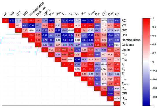 As previously discussed in detail, the pyrolytic behavior of the pellets was related to their ultimate/proximate composition, lignocellulosic fractions, and TG/DTG derived parameters. The fuel and chemical properties of the pellets used in this study, along with their relationships to pyrolytic parameters were computed pairwise Pearson correlation coefficients and summarized the results in the correlation matrix (Figure 3). Given the small sample size (n = 4), we report the coefficients as descriptive effect sizes without formal significance testing and, where relevant, provide Spearman correlations as a robustness check.