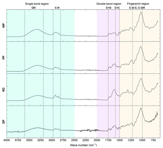 In the single bond region (≈3700–2800 cm−1), a broad O–H envelope at ~3400–3200 cm−1 appears in all samples due to hydrogen bonded hydroxyls in cellulose/hemicellulose; it is more pronounced in RD and PP, and slightly lower in WP and DP, matching their compositions in Table 1. The C-H stretches at ~2930–2850 cm−1 are clearer for WP and PP, consistent with their higher lignin/extractive-like aliphatics [51,72].