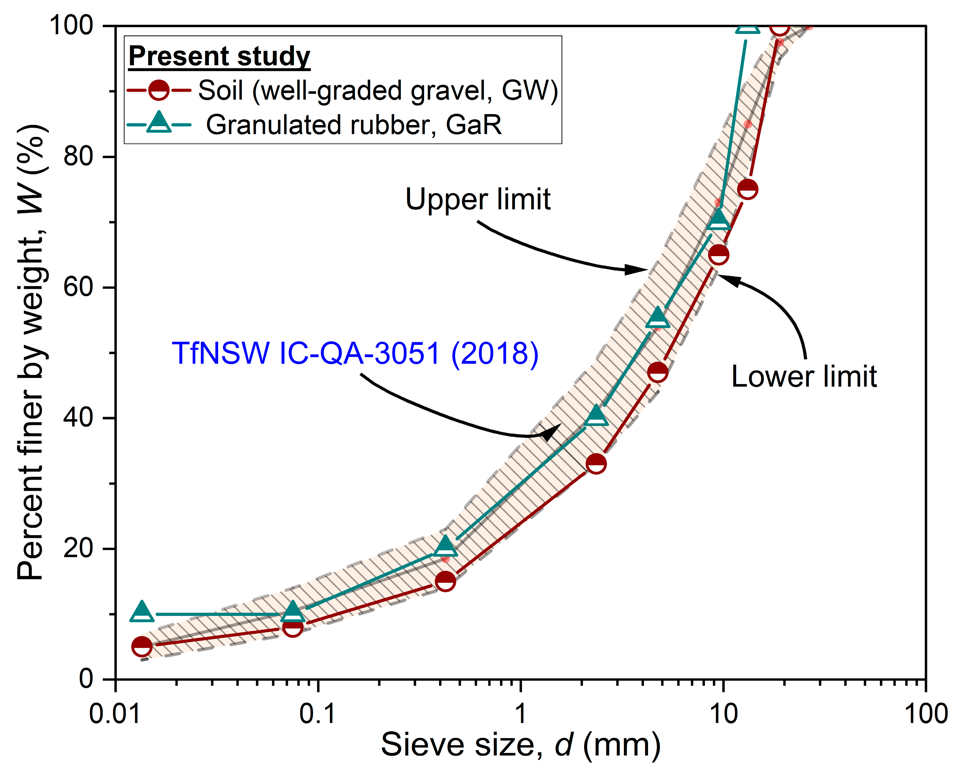 The composite proposed in the present study comprises three materials: soil (well-graded gravel), granulated rubber and PFA. All these materials were procured from local suppliers in Australia.
