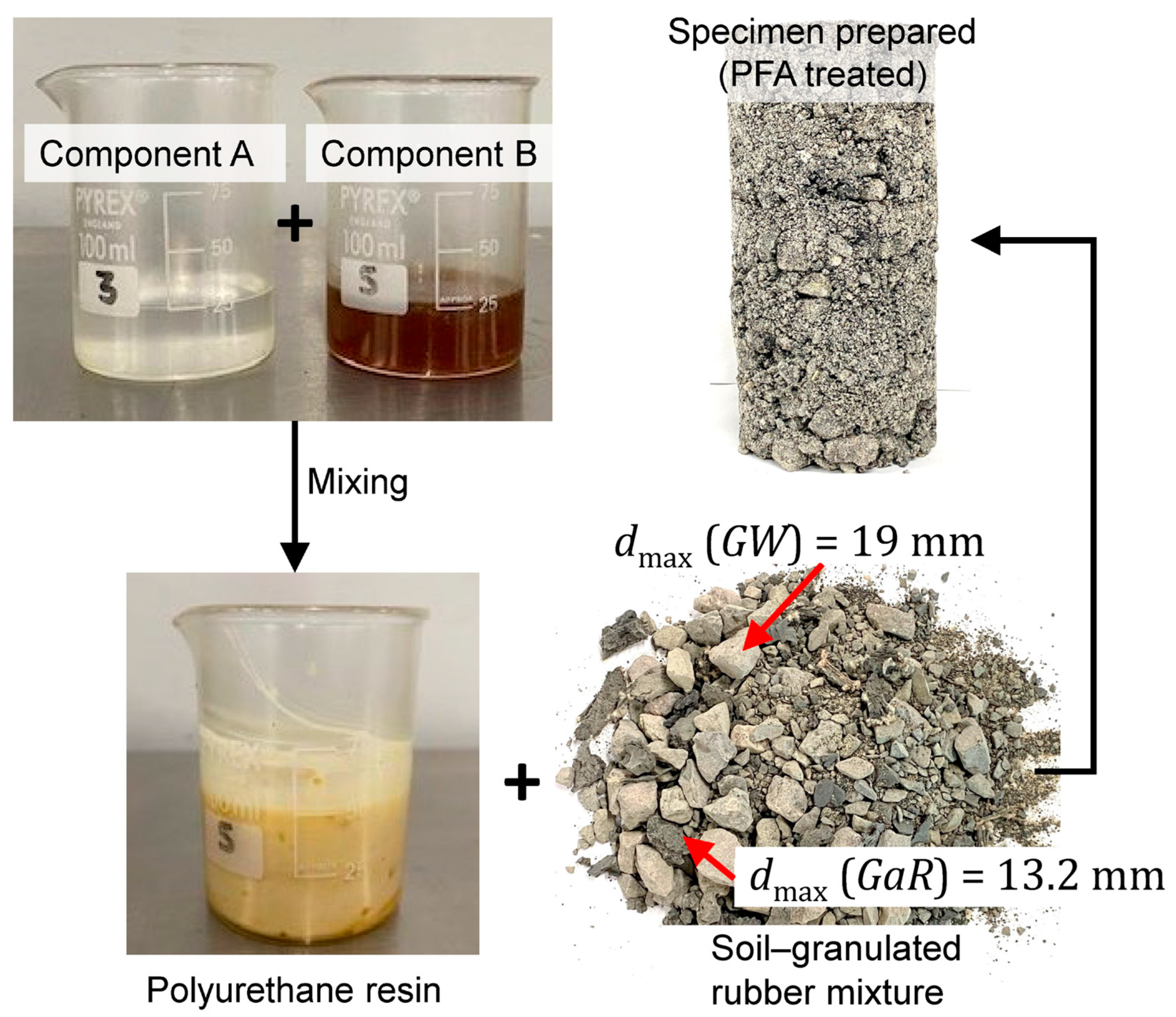 26] reported that the vertical settlement increased with a rise in rubber content in rubber aggregate–steel slag ballast mixtures. To address these limitations, stabilizing agents such as polyurethane foam adhesive (PFA) can be employed. As discussed later in this article, the resulting soil–rubber–PFA composite exhibits improved damping properties and reduced plastic deformation. These properties are highly desired for application as a base layer in ballastless railway tracks.