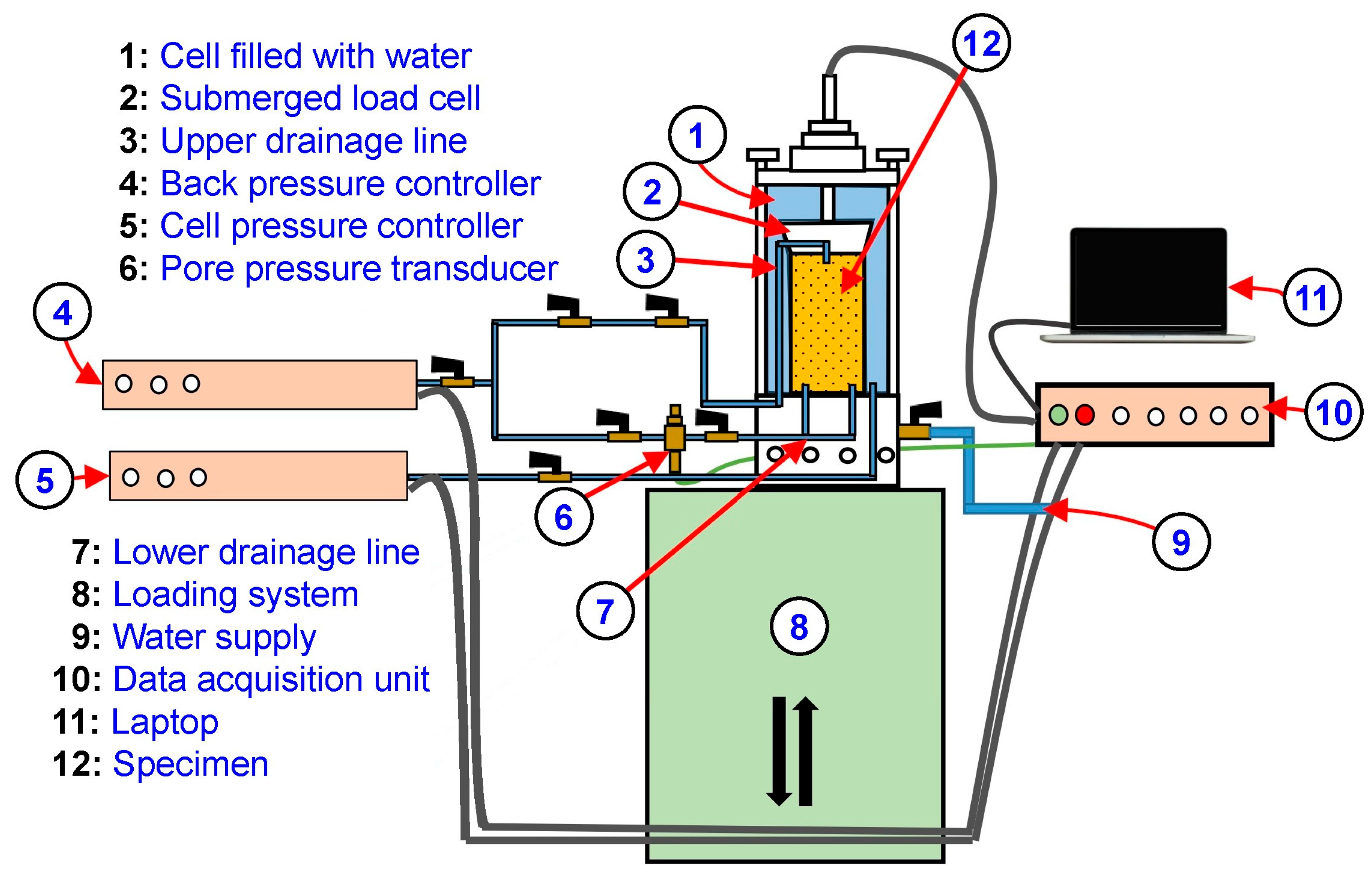 The novel composite material demonstrates strong potential as a sustainable base layer for ballastless railway tracks. This composite exhibited negligible cumulative residual vertical strain (0.29–0.98%) and minimal residual pore water pressure (~1–10 kPa) after 50,000 load cycles.